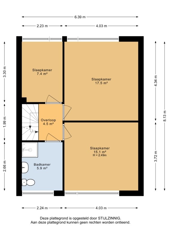 Vanaf de overloop zijn de drie ruime slaapkamers, de vaste trap naar de tweede verdieping alsmede de badkamer bereikbaar.
