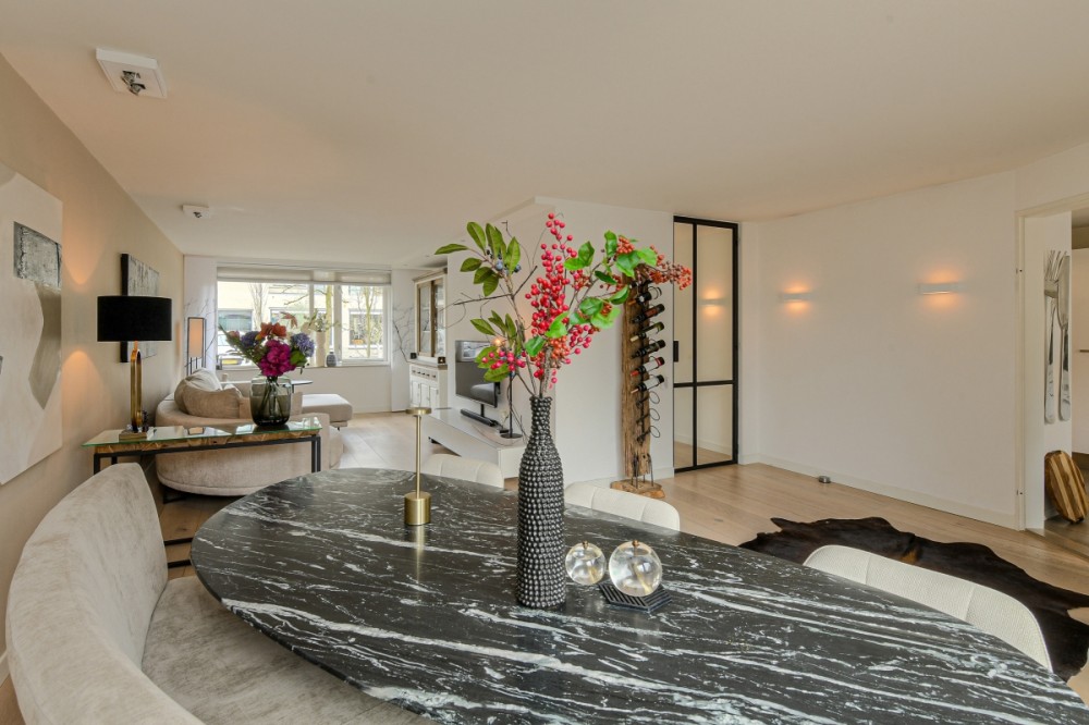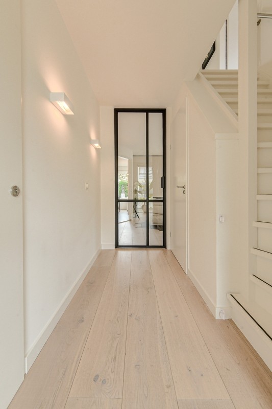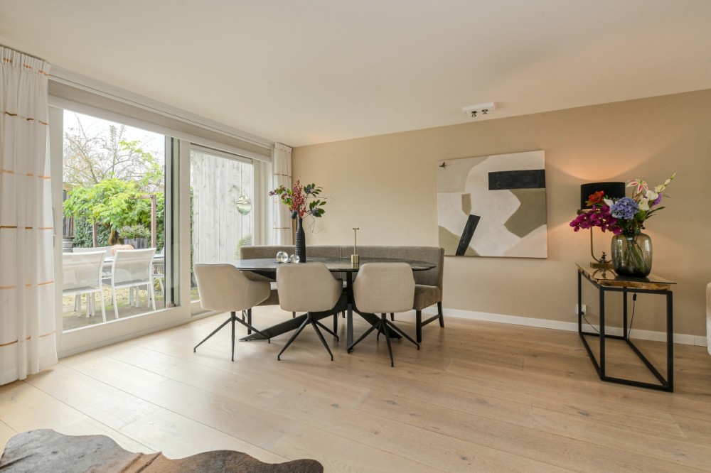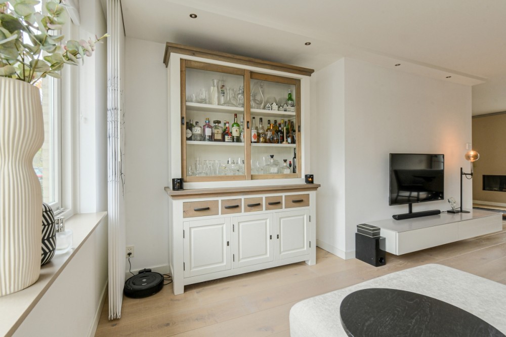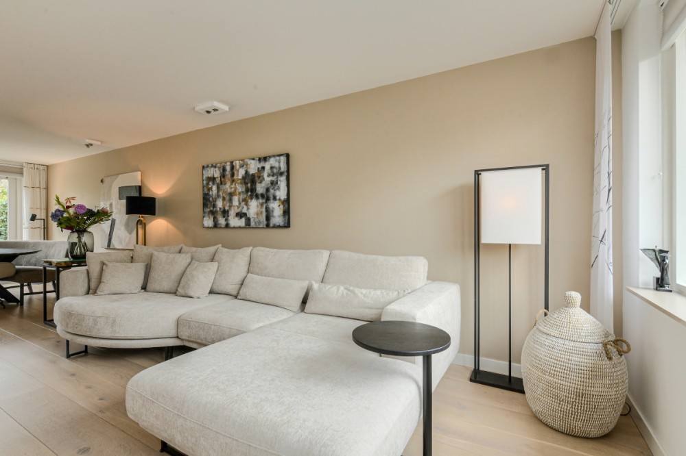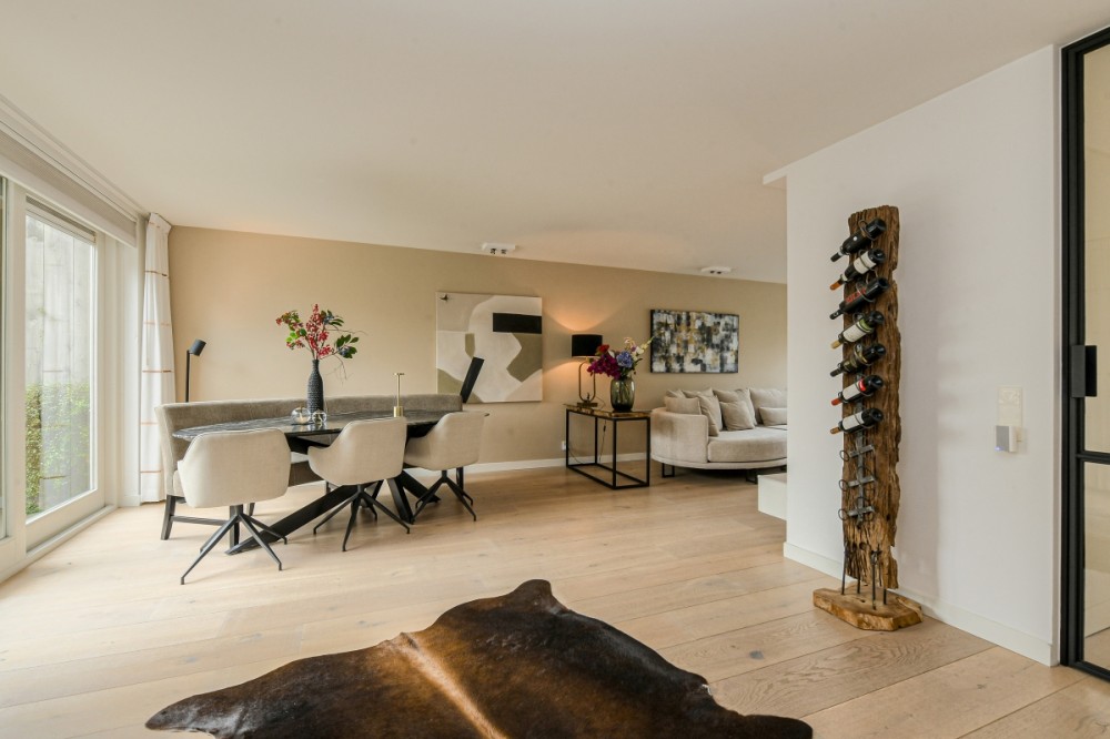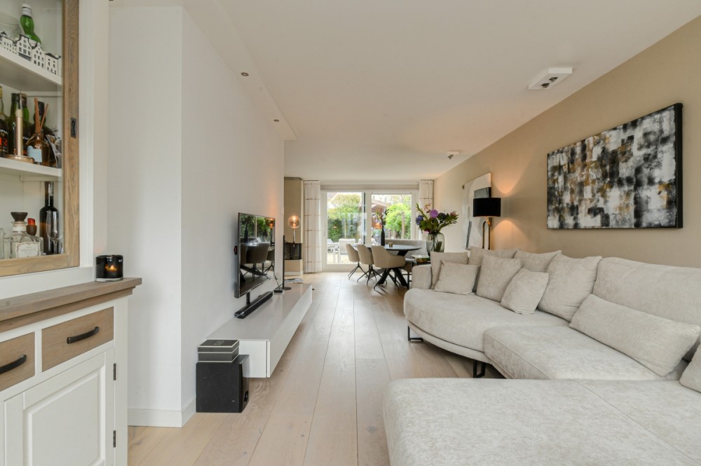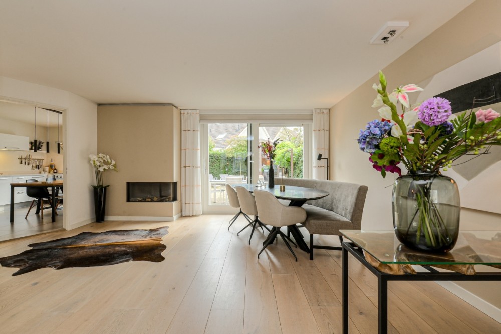 De woonkamer is zeer licht door de grote ramen. Door de eigentijdse stalen deur komt er ook daglicht vanuit de hal. Er is een design gashaard geplaatst. Via de pui betreedt u de tuin. Vanuit de woonkamer is er toegang tot een dichte keuken. De vloer is uitgevoerd in een whitewash eikenhouten vloer met vloerverwarming.