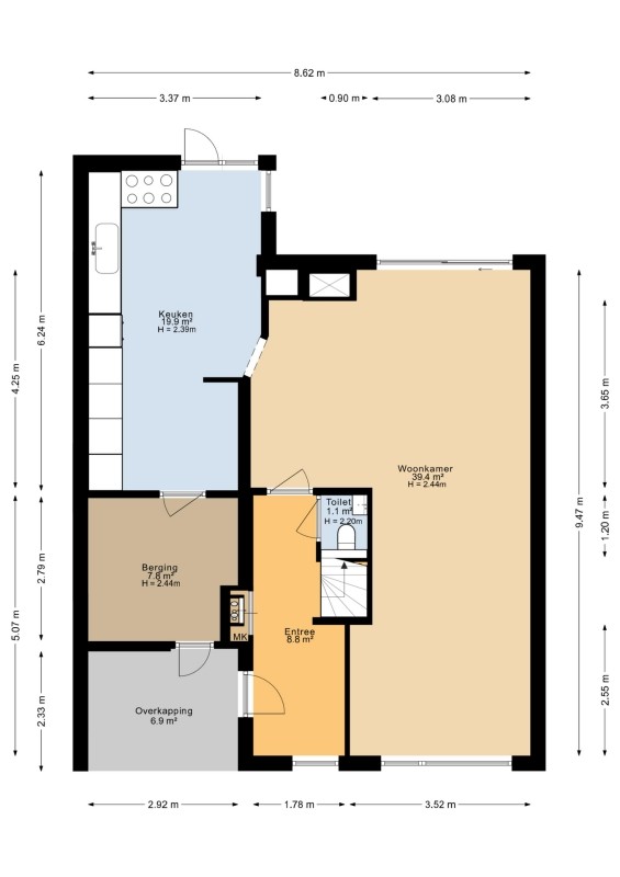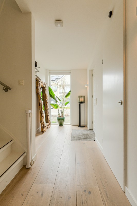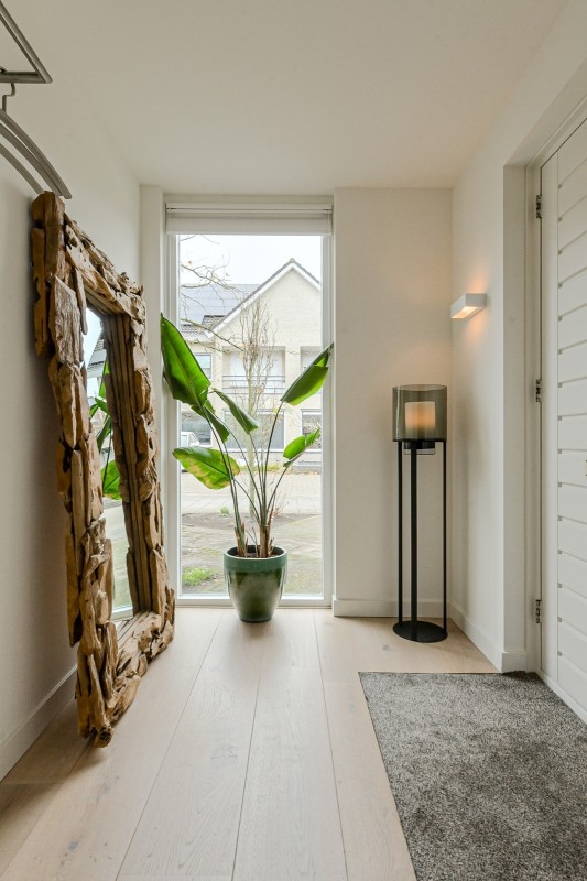De overdekte entree geeft toegang tot de ontvangsthal met toiletruimte v.v. hangcloset en fonteintje, meterkast, en trapopgang welke toegang geeft tot de eerste verdieping. De vloer is uitgevoerd in een eikenhouten vloer v.v. vloerverwarming.