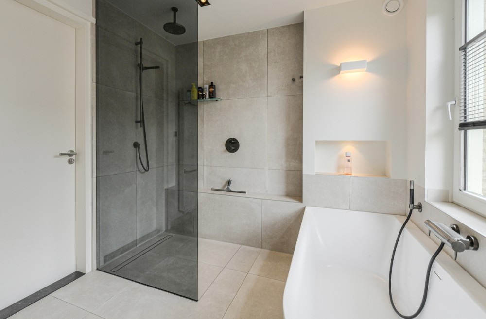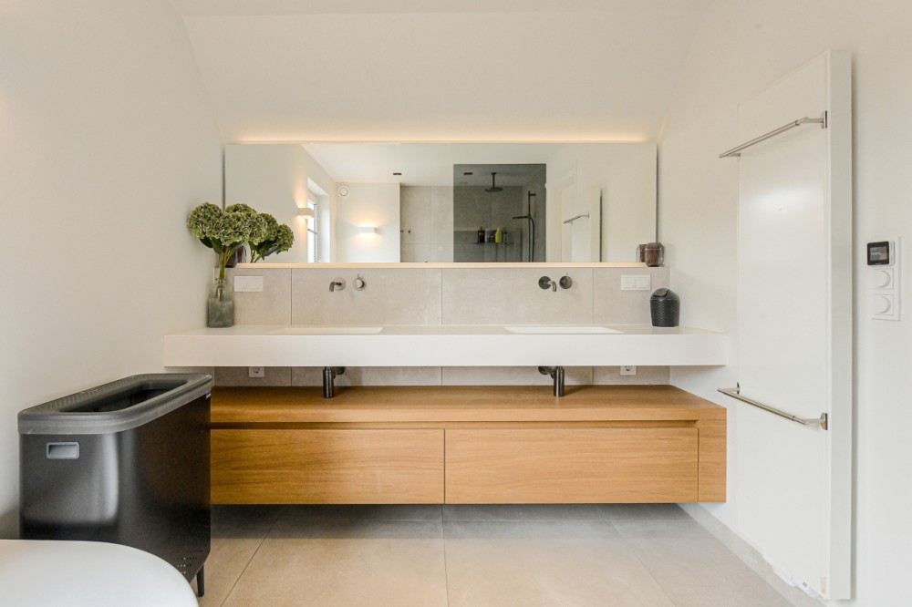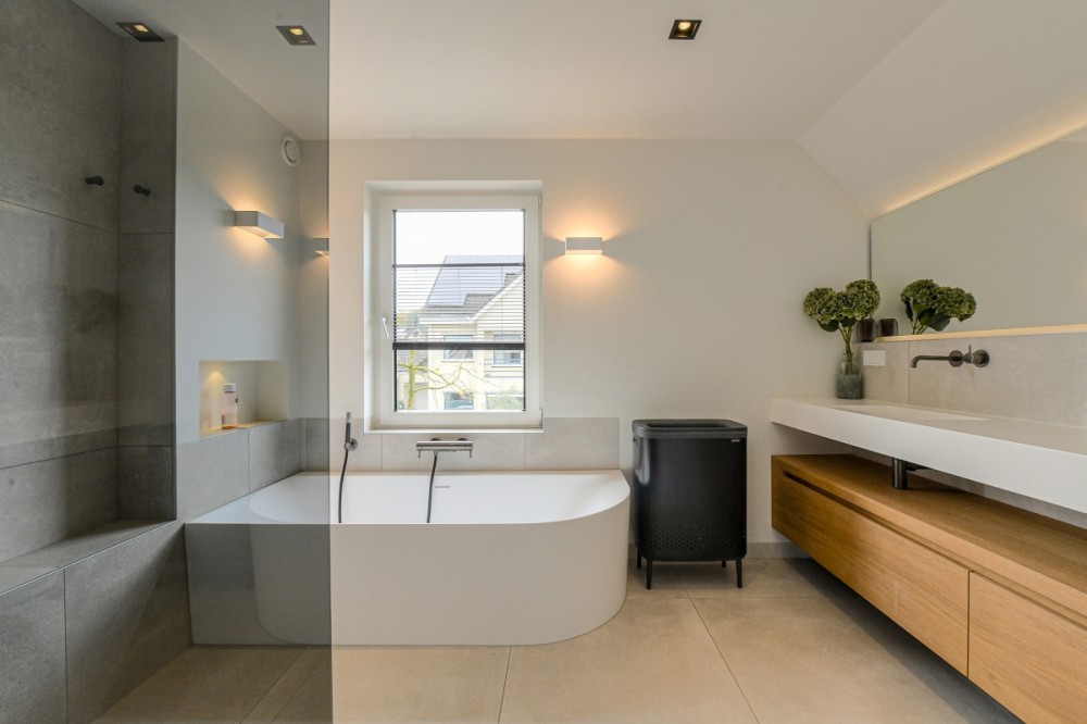 In 2021 vernieuwde luxe badkamer v.v. ligbad, inloopdouche, groot, maatwerk wastafelmeubel v.v. ladekasten, verwarmde spiegel met verlichting en designradiator. De badkamer is voorzien van electrische vloerverwarming.
