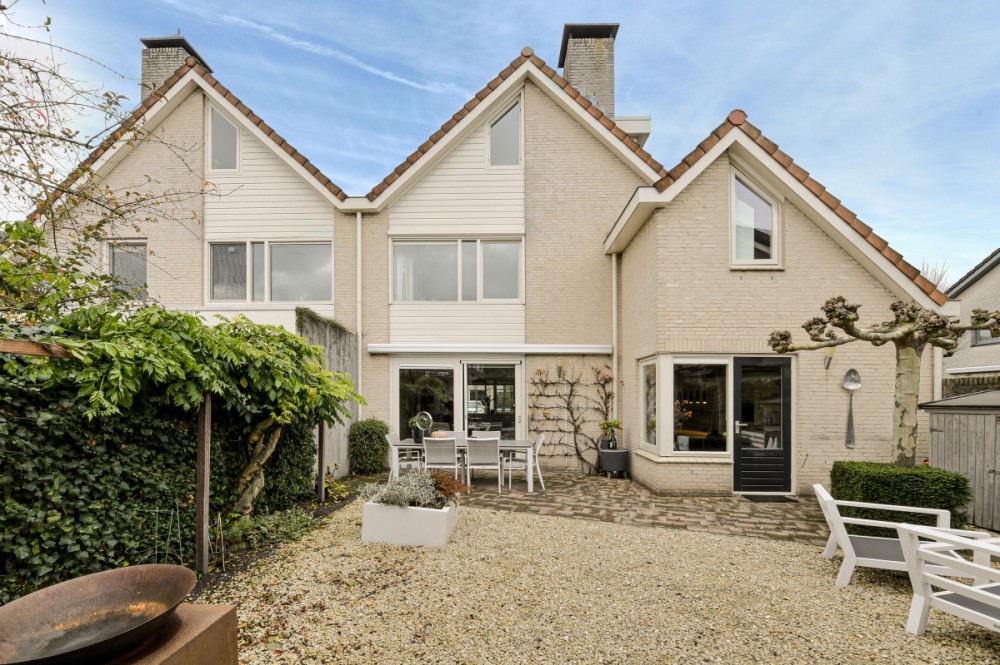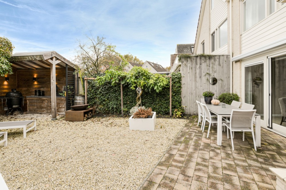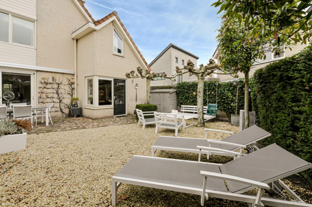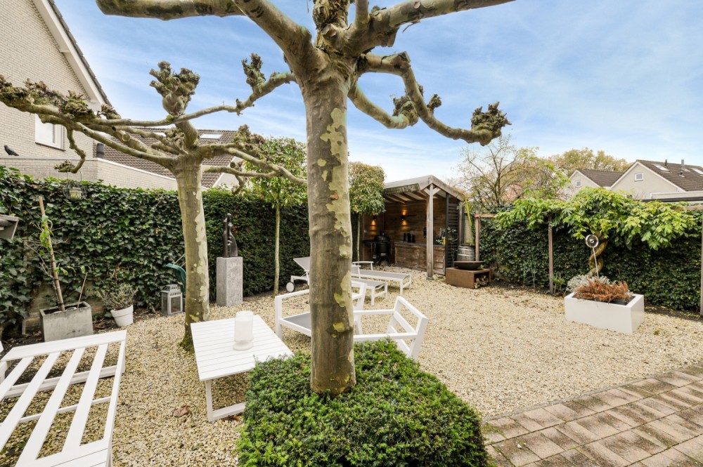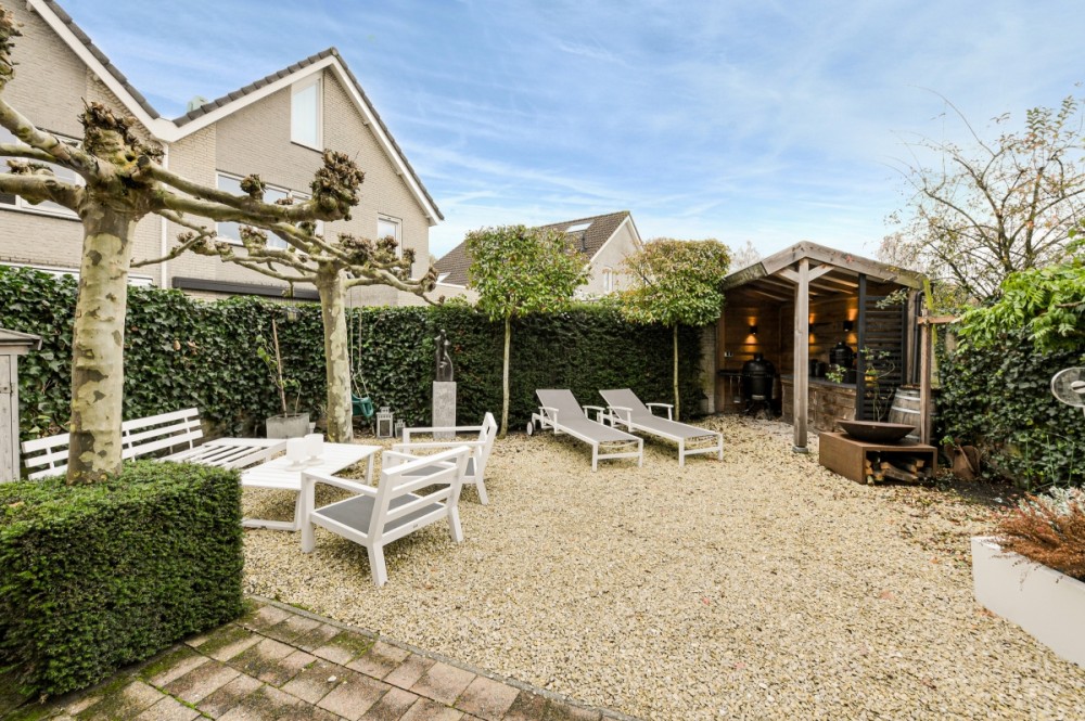 De omsloten achtertuin is gelegen op het zuid- oosten en beschikt over borders met beplanting, terrassen in sierbestrating, grind en tegen de achtergevel van de woning bevind zicht een groot zonnescherm.