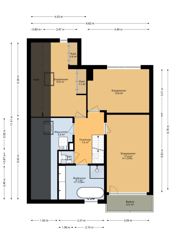 Overloop met vaste trapopgang naar de tweede verdieping welke toegang geeft tot de 3 ruime slaapkamers, badkamer, aparte toiletruimte en cv-ruimte. In deze ruimte zijn ook de wasmachine en droger ondergebracht.