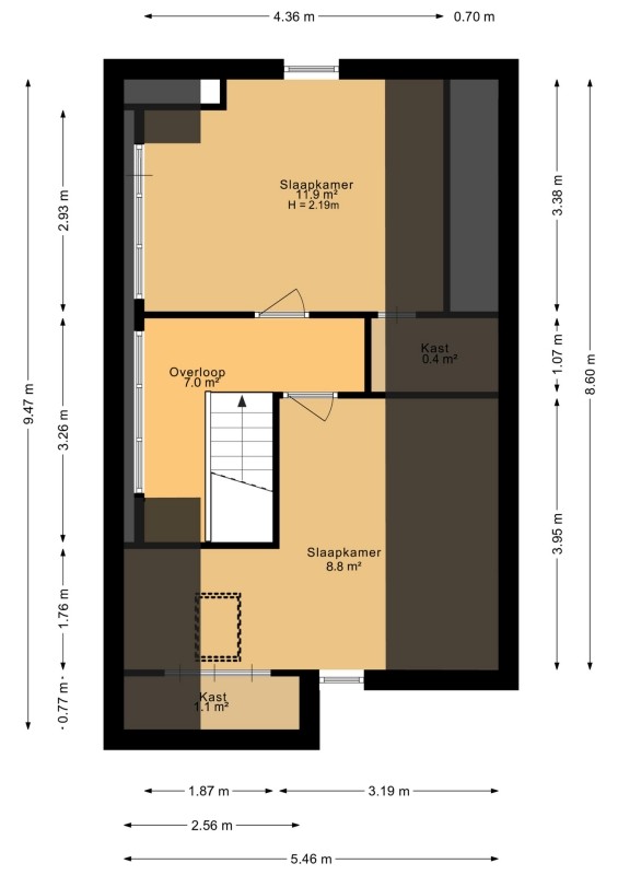 Slaapkamer 5, afm ca. 8.8 m² welke is voorzien van vaste kasten en pvc vloer.