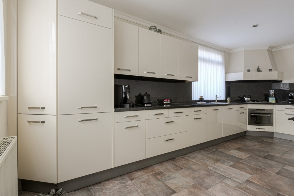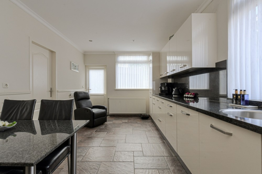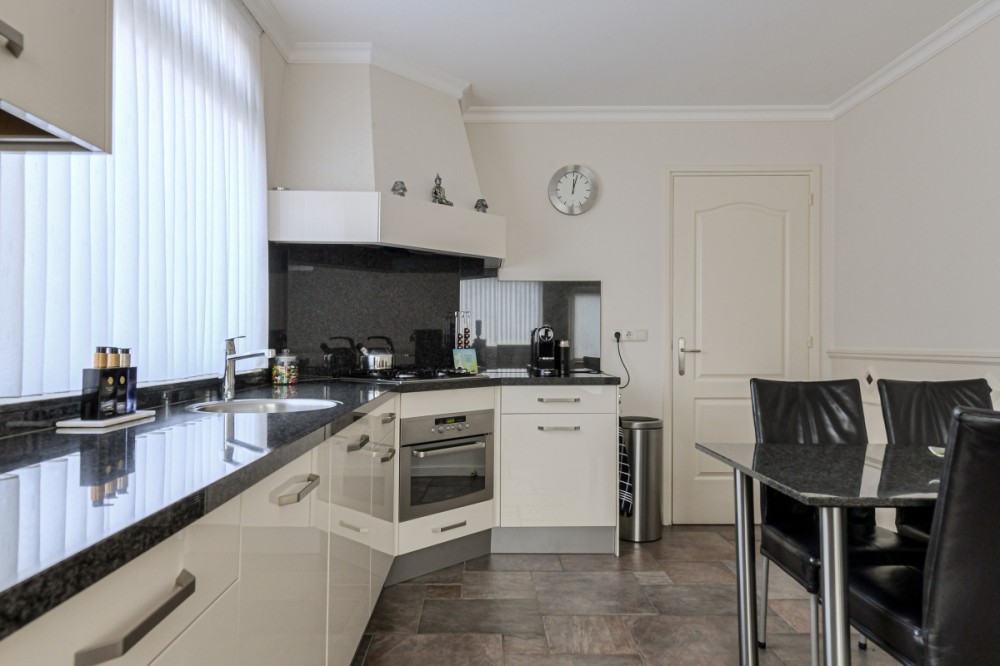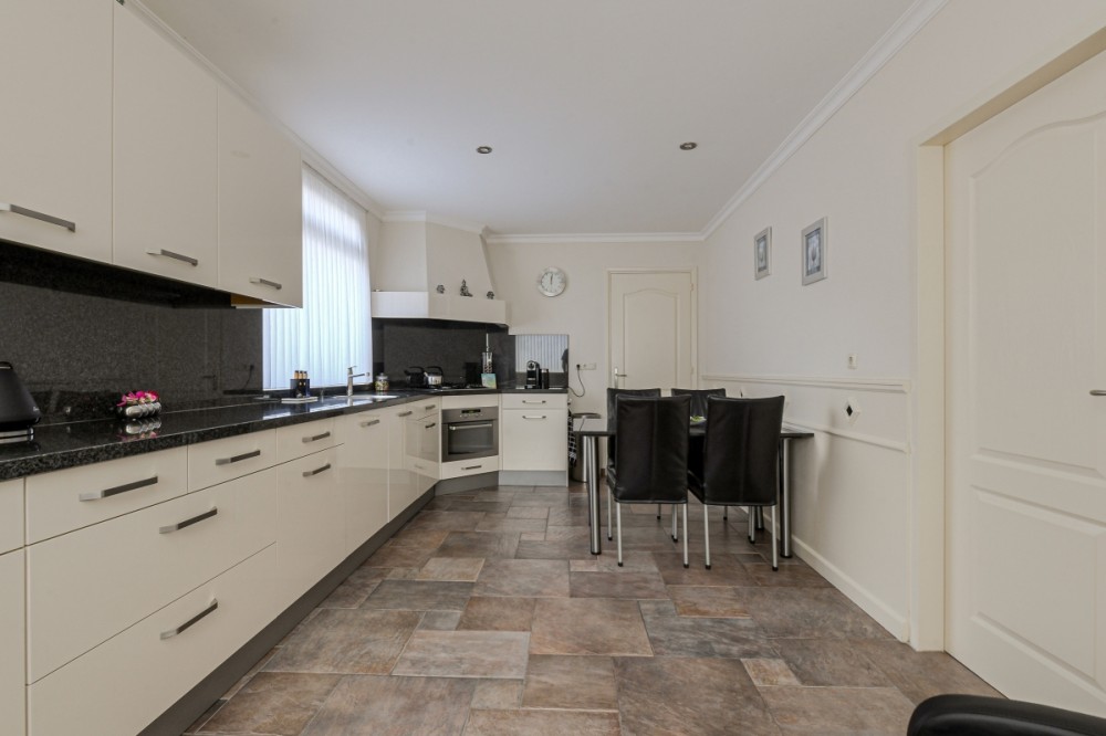 De dichte keuken is eveneens voorzien van de plavuizen vloer met vloerverwarming en uitgerust met een hoekkeukenopstelling voorzien van diverse boven- en onderkasten, hardstenen aanrechtblad en voorzien van diverse inbouwapparatuur, te weten; gaskookplaat, afzuigkap, vaatwasser, oven en koelkast.