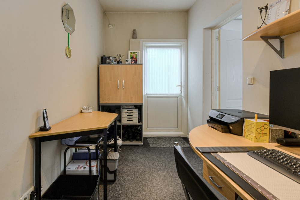 Direct aan de woning bevindt zich een extra ruimte die uitstekend geschikt is voor een kantoor, salon of praktijk aan huis. Deze ruimte maakt comfortabel thuiswerken of het ontvangen van klanten mogelijk, zonder dat dit ten koste gaat van het woongedeelte.