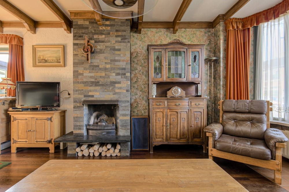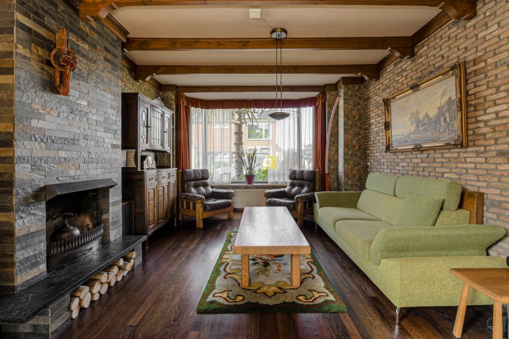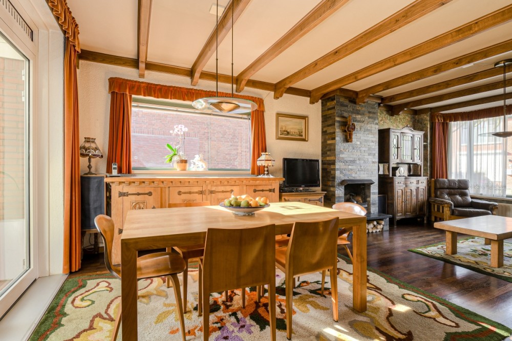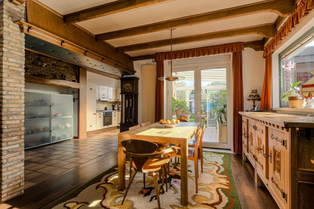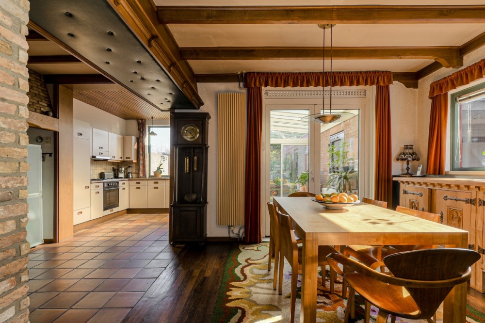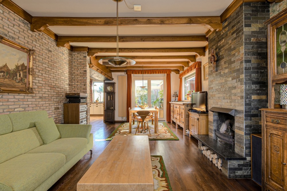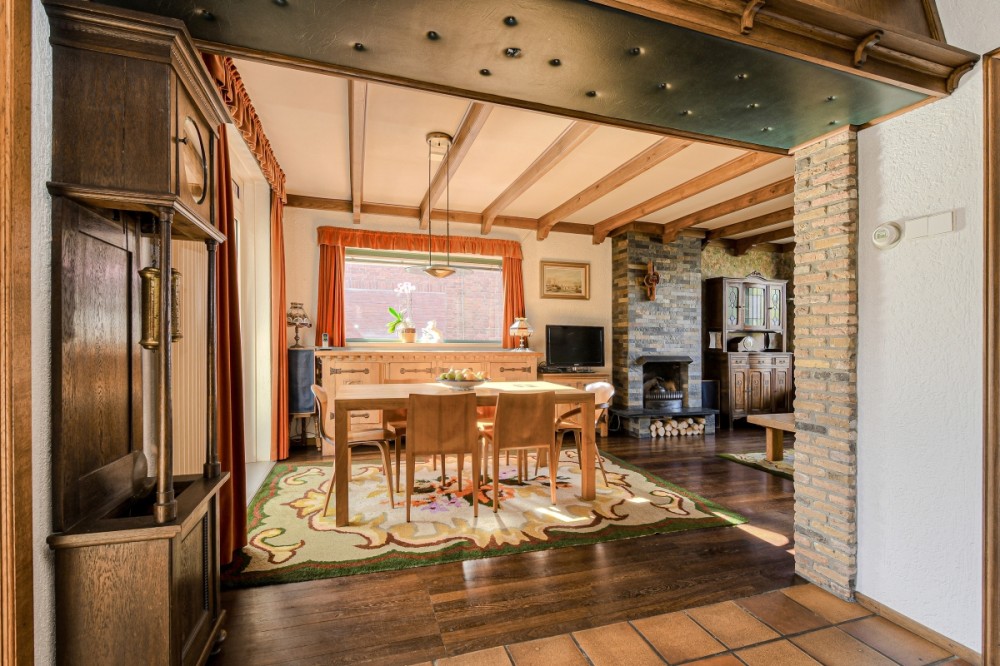 L-vormige woon/eetkamer, afmeting circa 33 m2, met sfeervolle parketvloer, balkenplafond, gedeeltelijk granolwanden, gedeeltelijk schoonmetselwerkwanden en behang. Hout gestookte openhaard in leisteen schouw. In het gedeelte van de woonkamer naar de keuken is eveneens een aansluiting voor een hout gestookte potkachel aanwezig. Middels openslaande deuren (in aluminium uitgevoerd) toegang tot de aangebouwde serre.