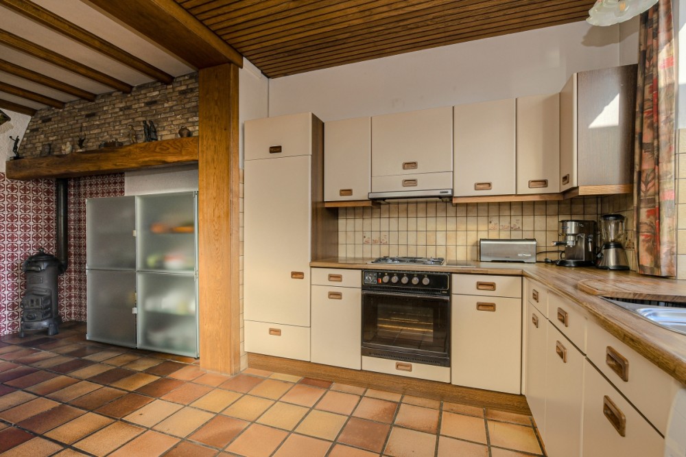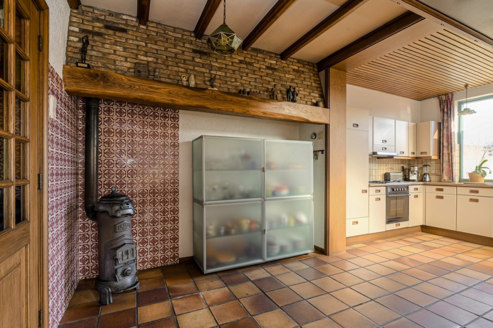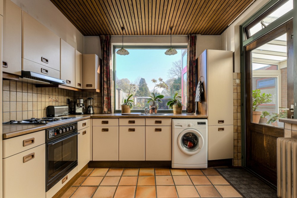 Uitgebouwde woon/eetkeuken, afmeting circa 8 m2, met tegelvloer en L-vormig keukenblok. Het keukenblok is uitgerust met diverse boven- en onderkastjes, inclusief diverse inbouwapparatuur, te weten; afzuigkap, gaskookplaat, oven, close in boiler, koelkast en aansluiting ten behoeve van de wasautomaat.