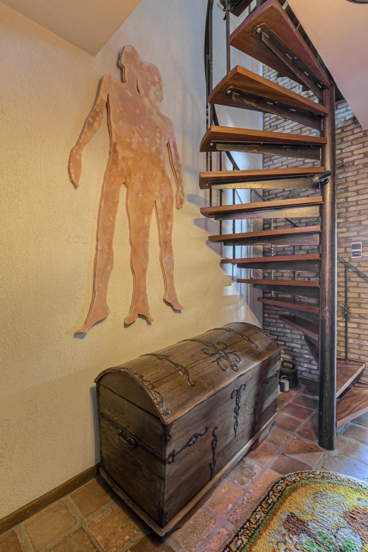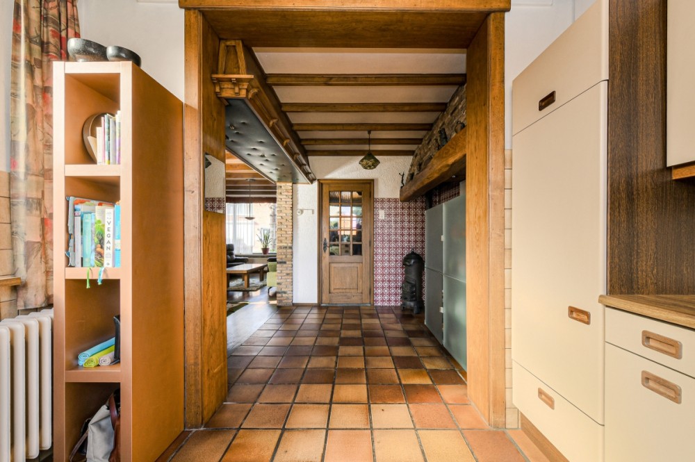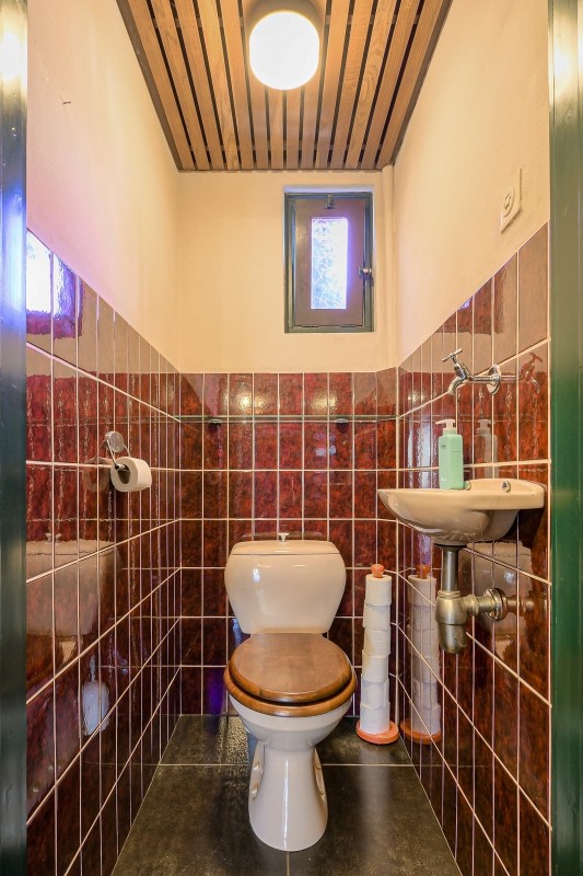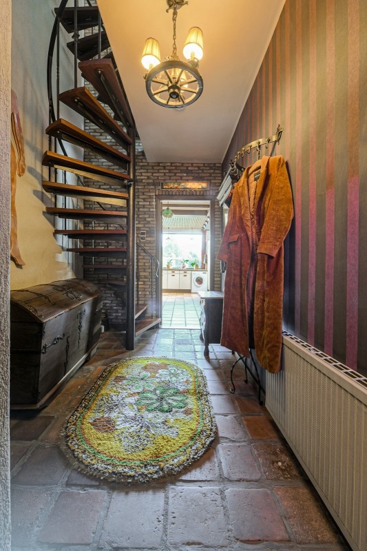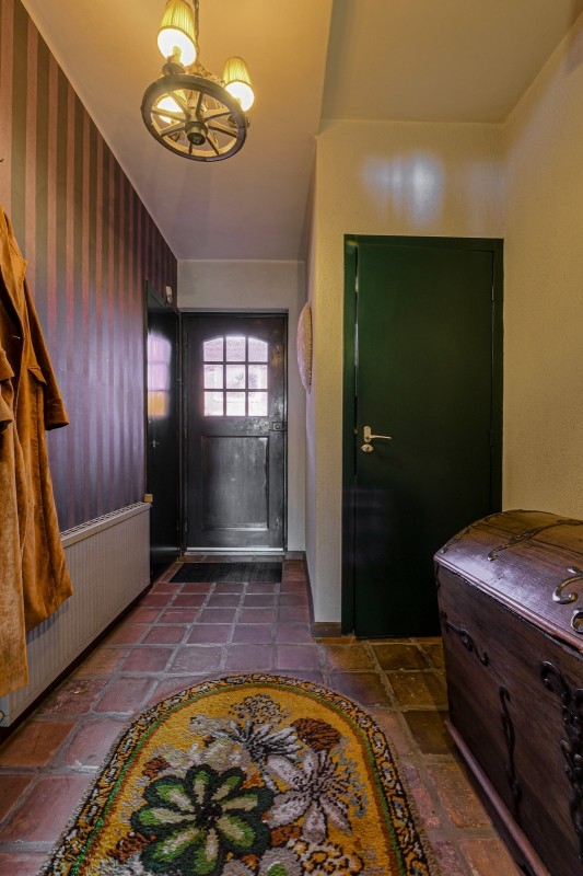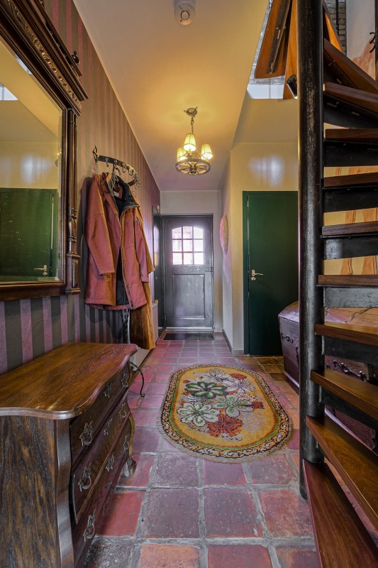 Hal/entree met boeren plavuizen vloer, meterkast, spiltrap, garderobe en gedeeltelijk betegeld toilet met fontein.