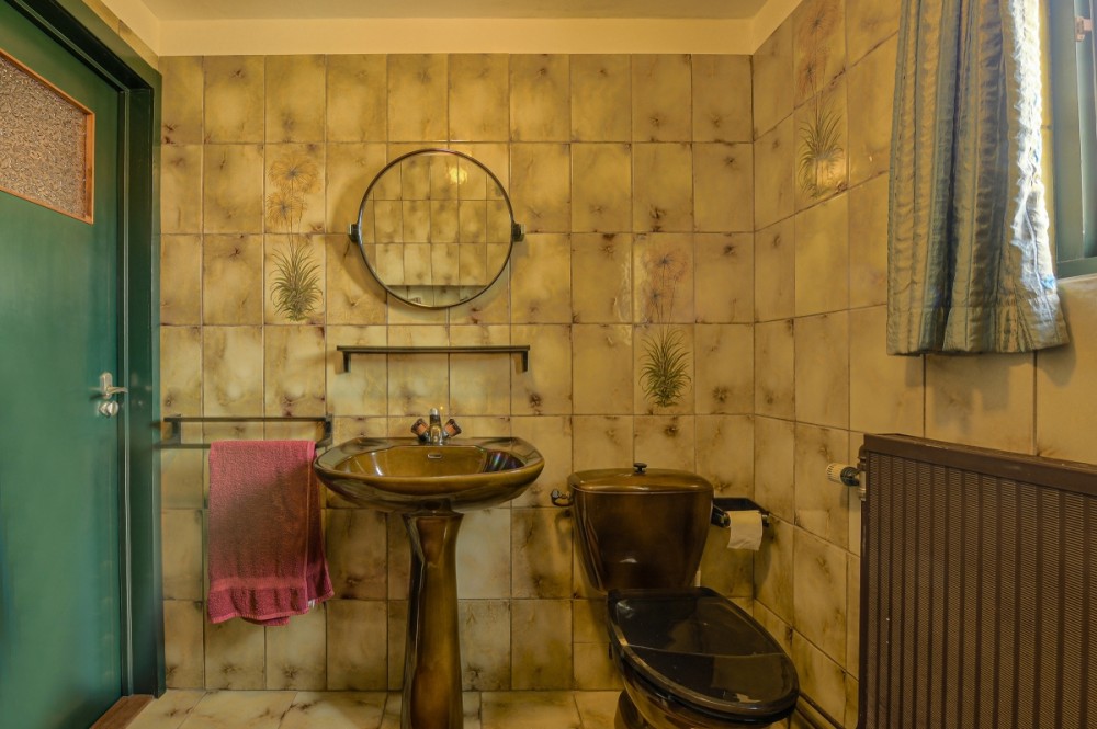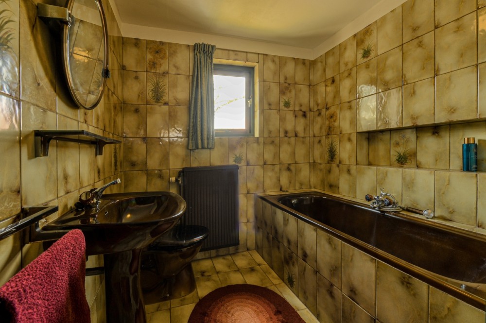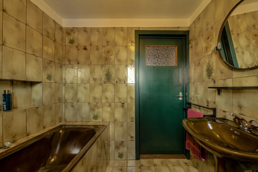 Betegelde badkamer met ligbad, toilet en vaste wastafel.