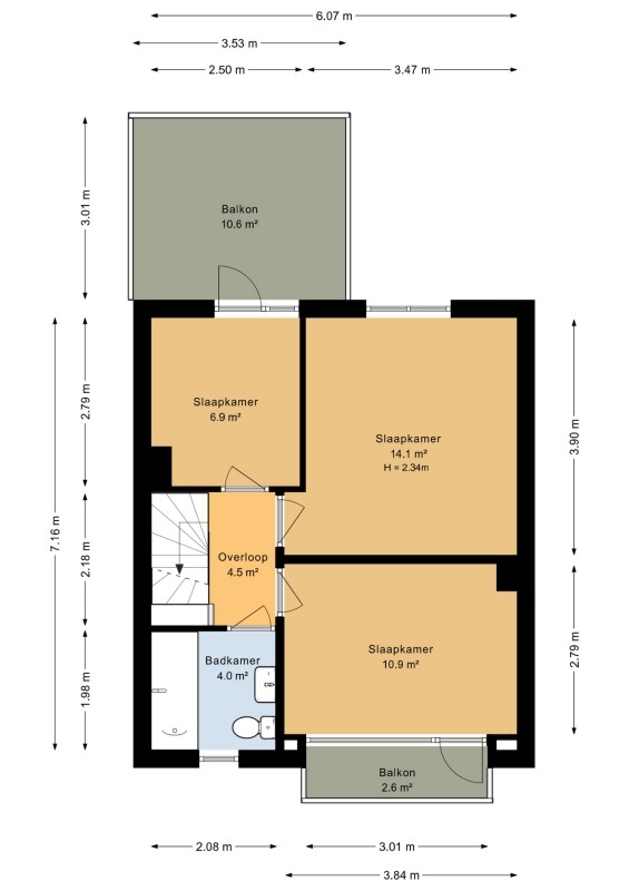 Overloop met toegang tot 3 slaapkamers. Slaapkamer afmeting circa 2.79 x 2.50 m. met toegang tot balkon. Slaapkamer achterzijde afmeting circa 3.90 x 3.47 m. Slaapkamer voorzijde afmeting circa 3.47 x 2.79 m. met balkon. Zowel de overloop als de slaapkamers zijn voorzien van een massieve parketvloer (mozaikvorm)