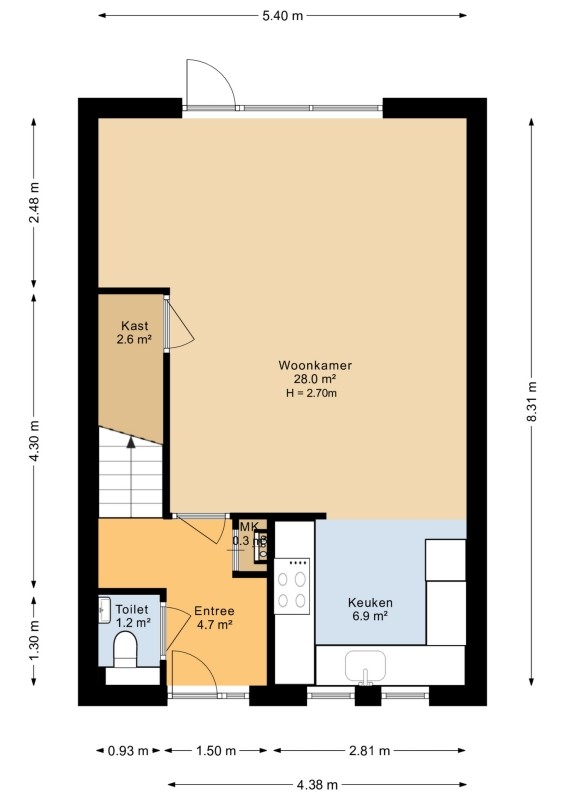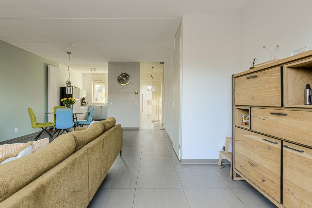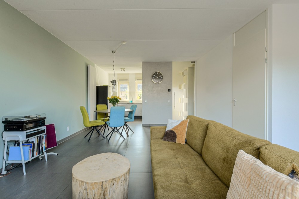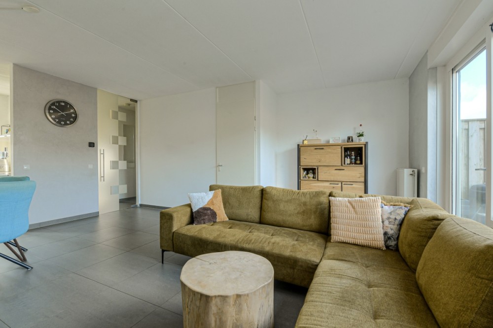 De L vormige woonkamer ca. 30m² is voorzien van grotendeels Italiaans stucwerk wanden, een plavuizen vloer, trapkast en geeft middels de openslaande deur toegang tot de achtertuin en de aan de voorzijde gesitueerde half open keuken.