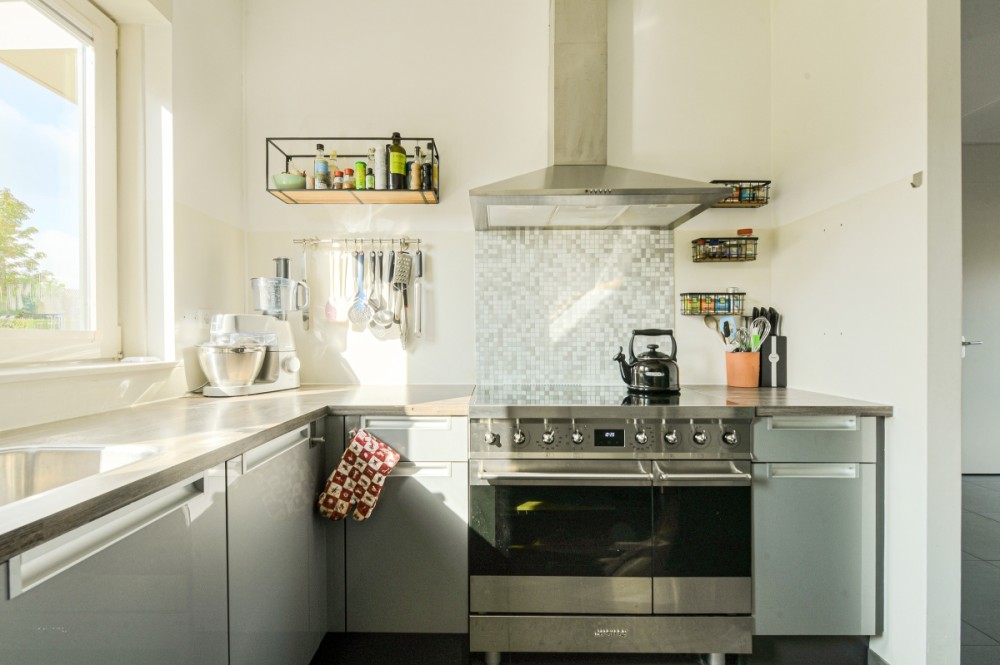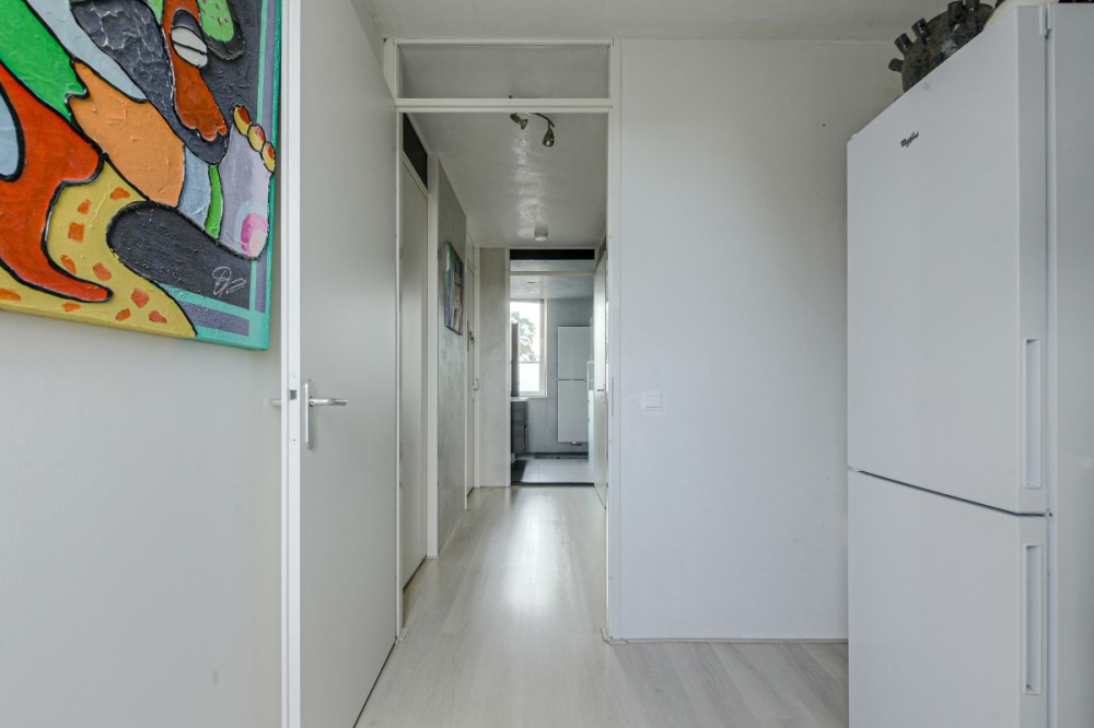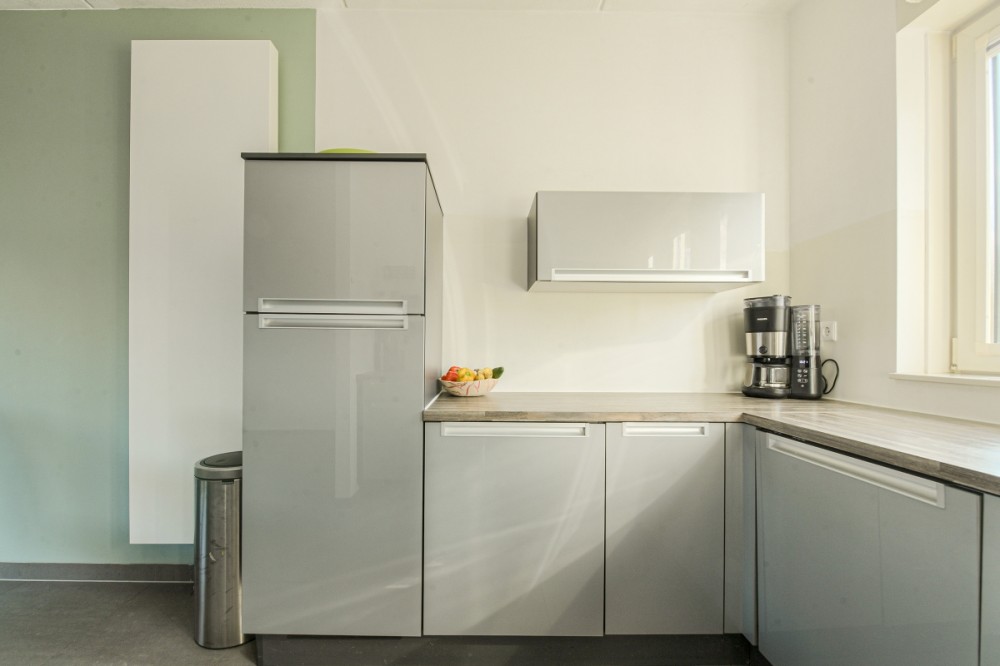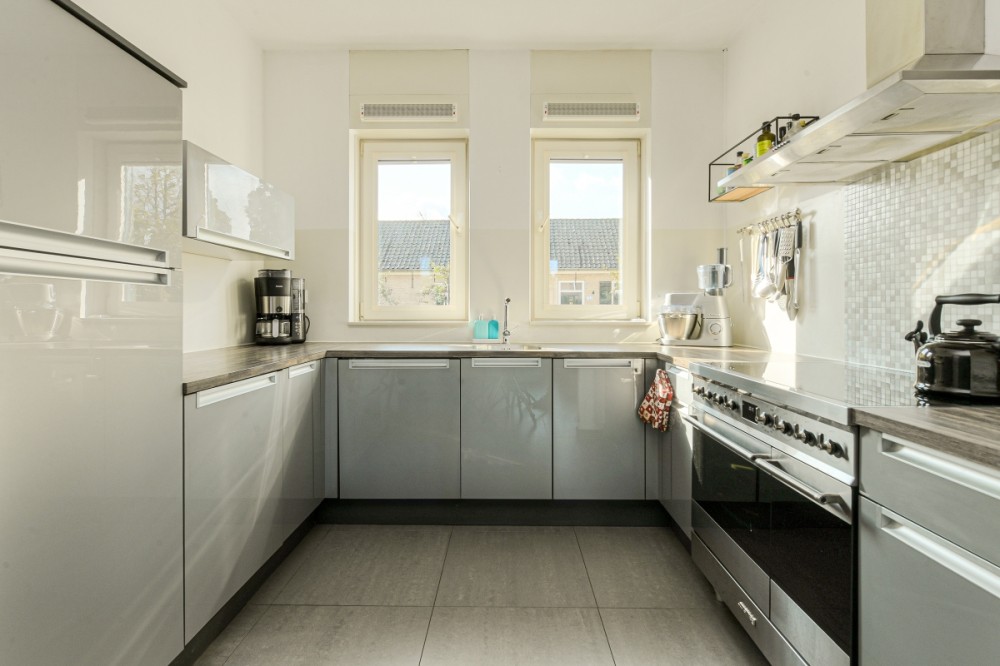 De keuken is voorzien van een moderne U-vormige hoogglans keukeninrichting met diverse inbouwapparatuur te weten: fornuis met inductie kookplaat en oven, afzuigkap, koelkast, vaatwasmachine en meer dan voldoende bergruimte. De gehele woning is voorzien van stucwerk wanden.