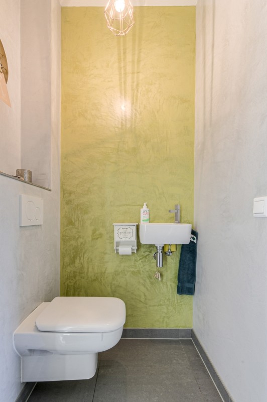 Entree/hal met plavuizen vloer, meterkast ( 3 fasen ), trapopgang naar de eerste verdieping en modern toilet met fonteintje uitgevoerd met Italiaans stucwerk wanden.