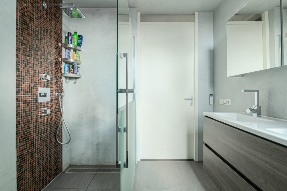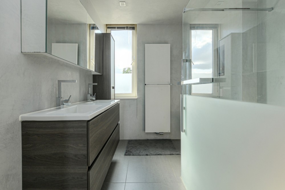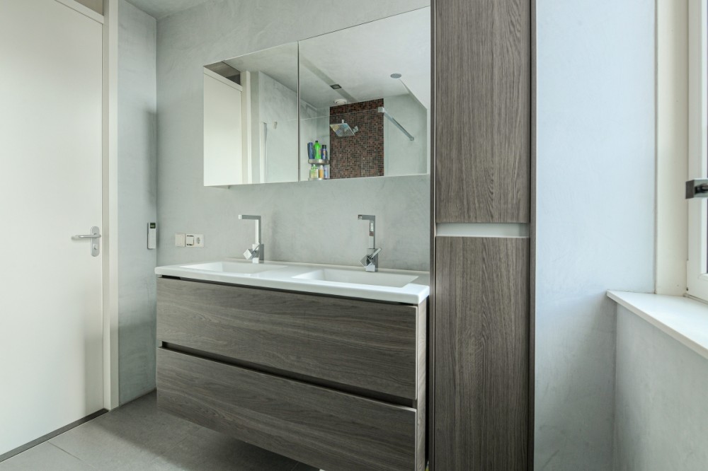Met Italiaans stucwerk uitgevoerde badkamer met inloopdouche, dubbele vaste wastafel, wandcloset en designradiator.
