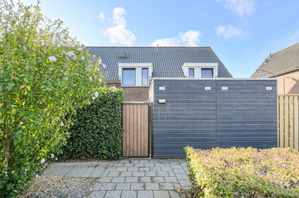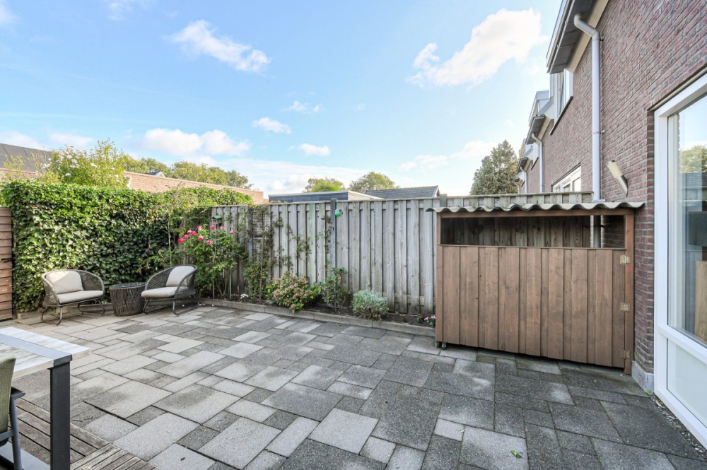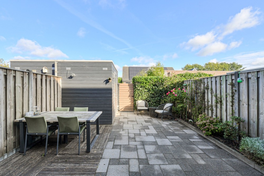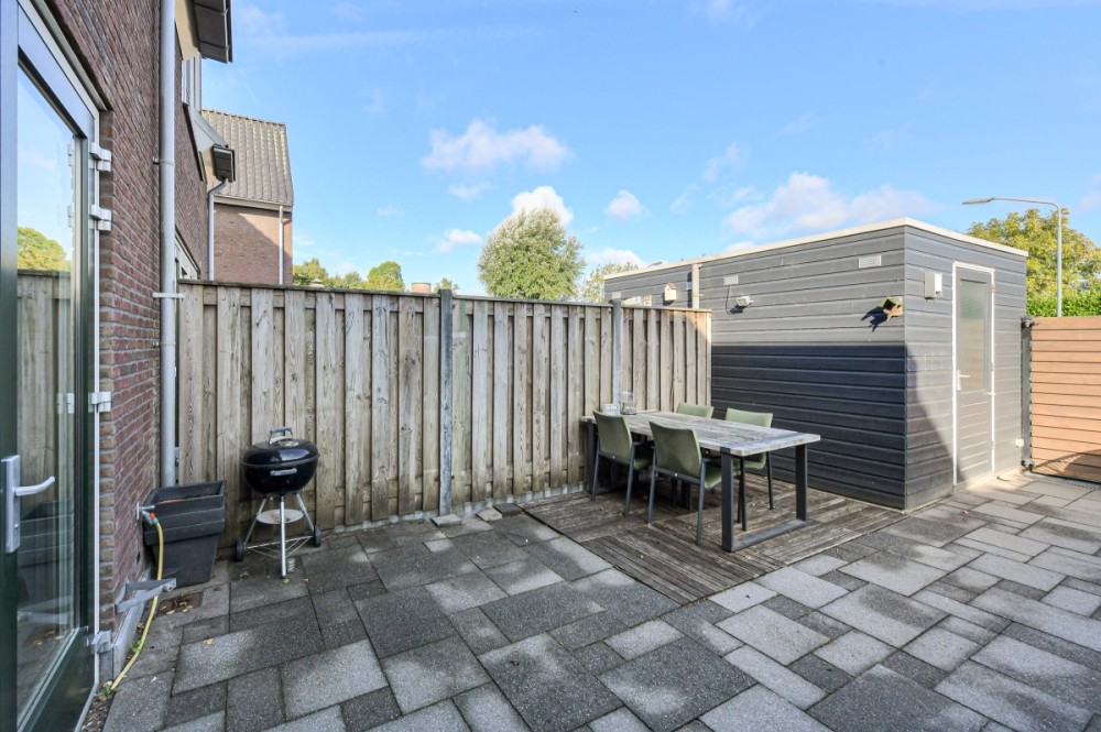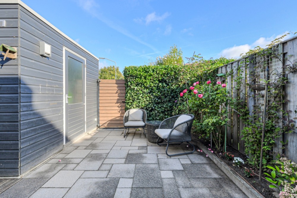 Op het noorden gelegen achtertuin met achterom (afmeting circa 8.50m. diep en 5.50m. breed), sierbestrating en houtenberging welke is voorzien van elektriciteit.