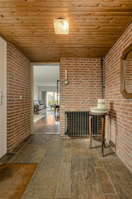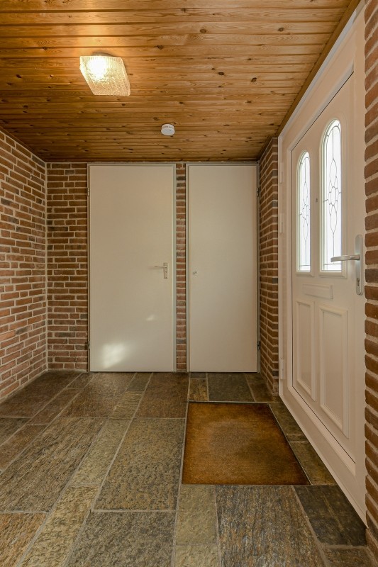 Hal/ entree met leistenen vloer, geheel betegelde toiletruimte met fonteintje, garderobe en meterkast.