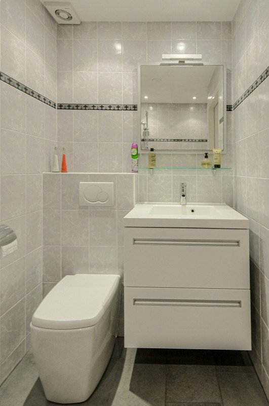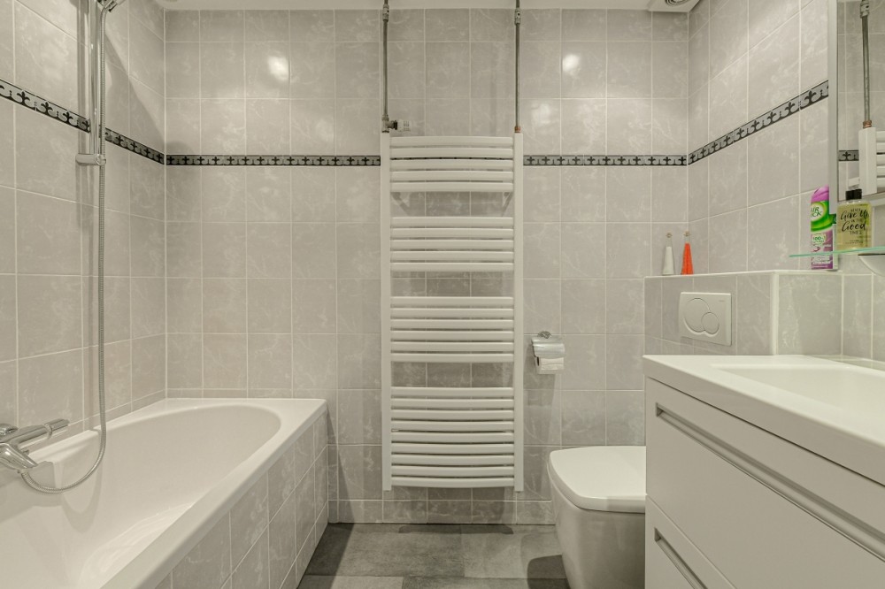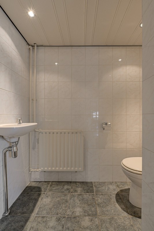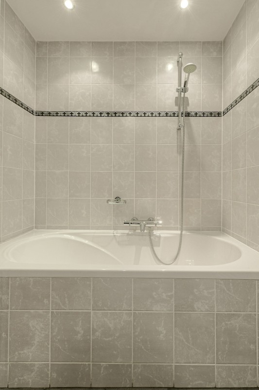 De geheel betegelde, badkamer is voorzien van een vaste wastafel met meubel, design radiator, spiegel, mechanische ventilatie, ligbad en tweede toilet.