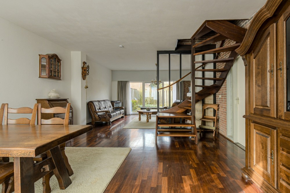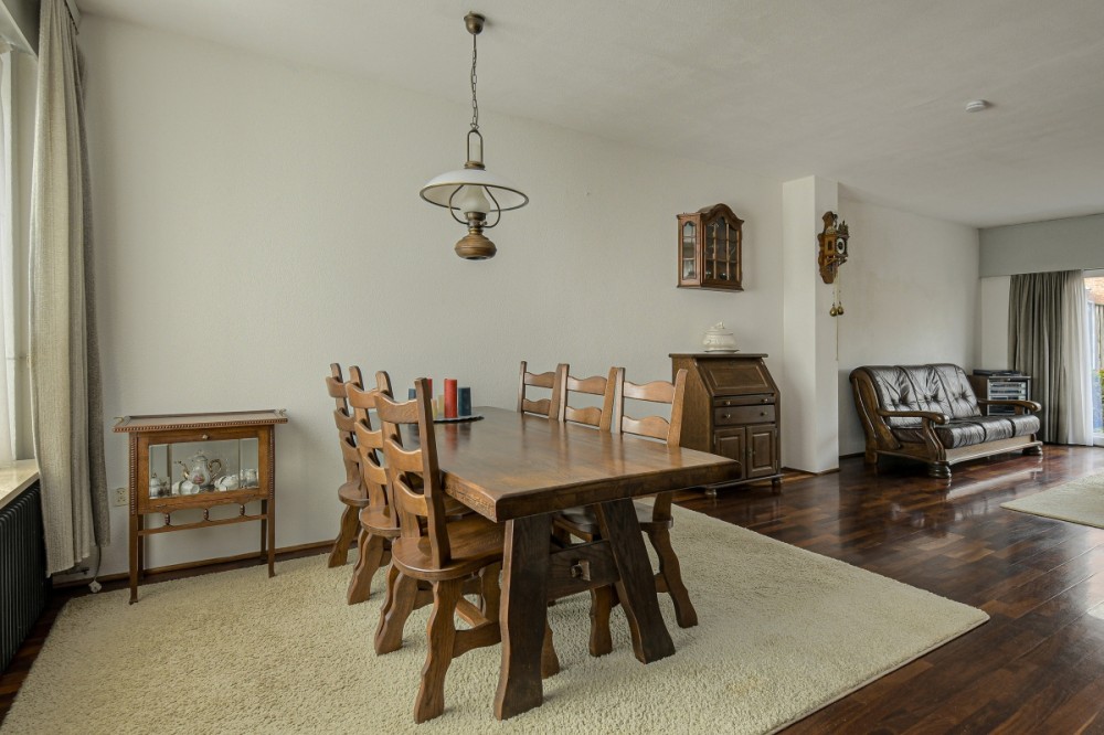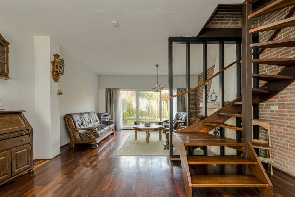 Royale doorzon woonkamer, afm. ca. 8.92 x 4.77m (ca. 42m2), met stroken parketvloer en tuin georiënteerde zitkamer met kunststof raampartijen en schuifpui welke toegang geeft tot de achtertuin.