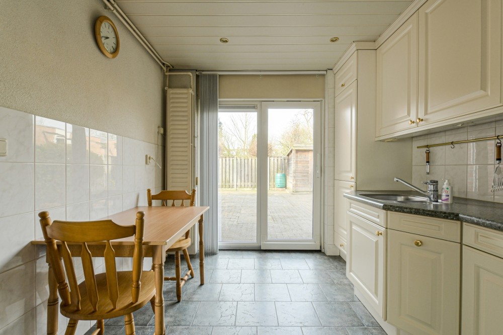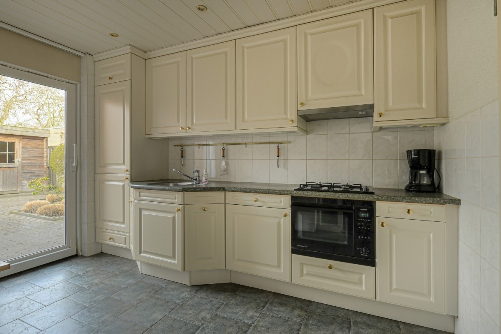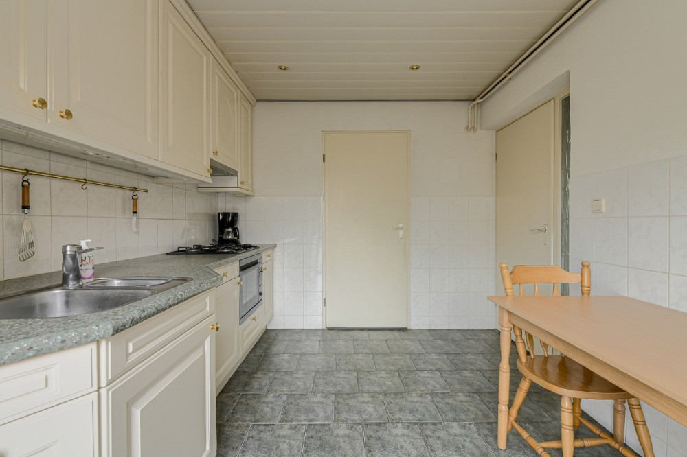 Vanuit de woonkamer is de naar de zijkant georiënteerde keuken (ca. 9.5m2) bereikbaar welke is voorzien van een tegelvloer en een nette keukeninrichting. Deze is voorzien van diverse inbouwapparatuur, te weten; gaskookplaat, afzuigkap, combi oven/ magnetron, koel/ vrieskast. Vanuit de keuken is eveneens de achtertuin te bereiken.