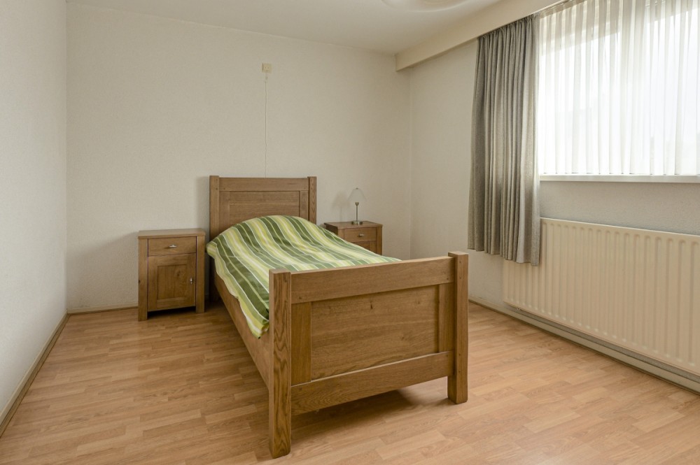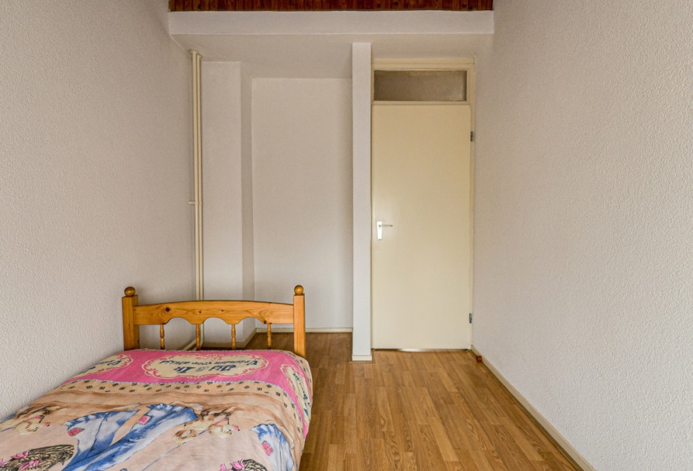 Ruime slaapkamer 3 aan de achterzijde, afm. ca. 3.37 x 2.40m (ca 8m2) met kunststof draai-/kiepramen voorzien van een voorzet hor.