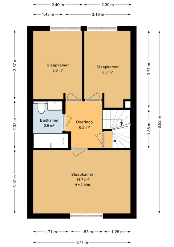 Overloop welke toegang geeft tot de 3 slaapkamers, de badkamer en tot de vaste trapopgang naar de tweede verdieping,