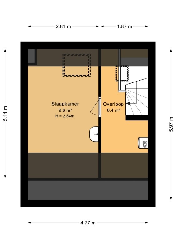 Slaapkamer 4, afm ca 5.11 x 2.81m (ca. 10m2) ., voorzien van een wastafel met warm en koud water, kunstof Velux dakraam en vloerbedekking.