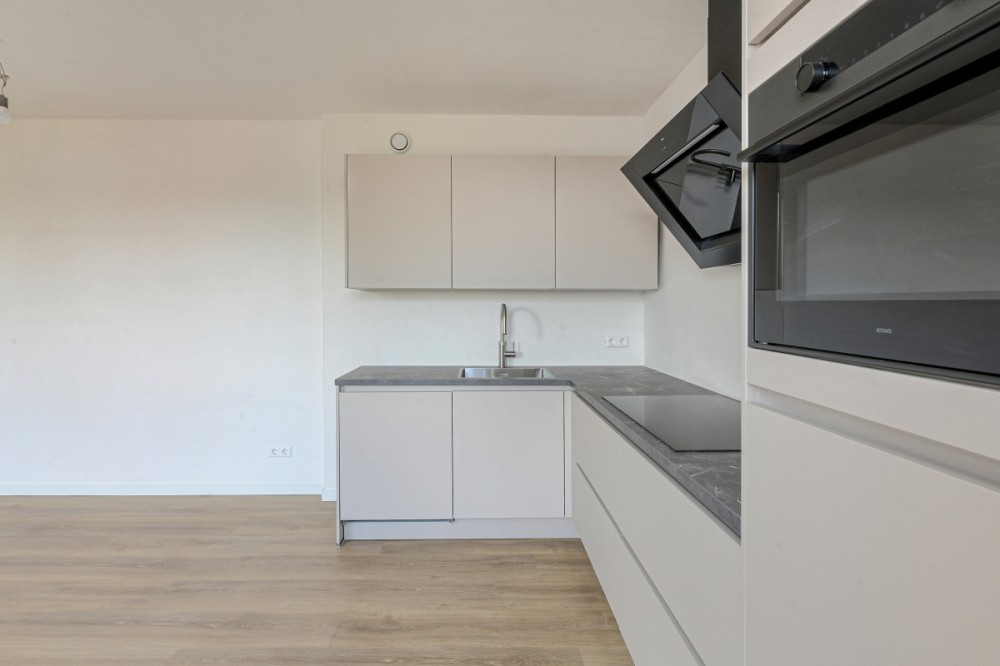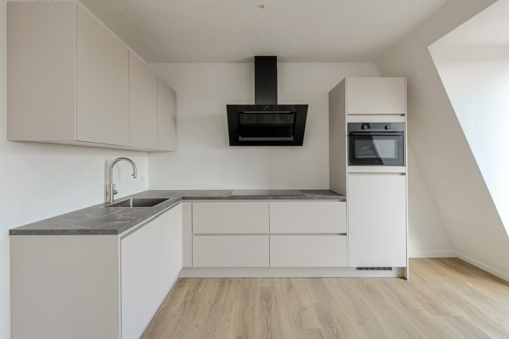 De open keuken is uitgerust met moderne, strakke hoekkeukenopstelling met diverse inbouwapparatuur, te weten; een inductiekookplaat, afzuigkap, Quooker, vaatwasser, oven en koelkast. De keuken is strak vormgegeven en straalt kwaliteit uit. In de woonkamer zijn tevens de intercom (video intercom met kleurendisplay) en temperatuurregelaar geplaatst.