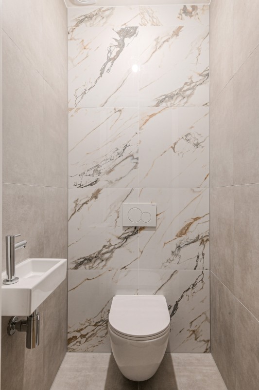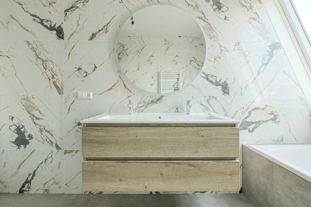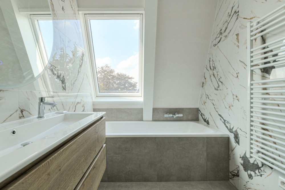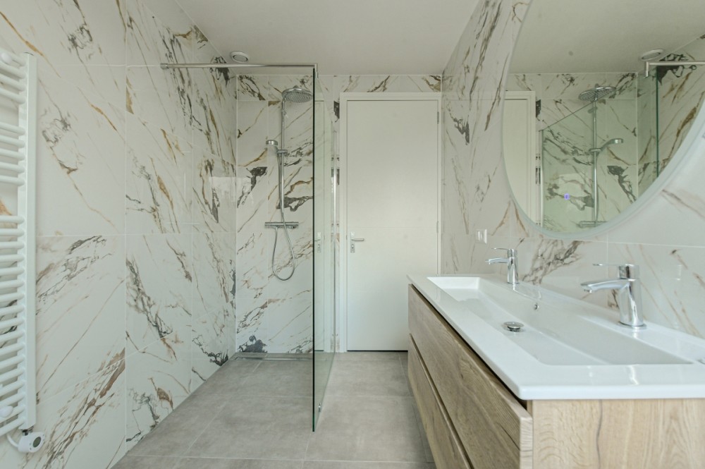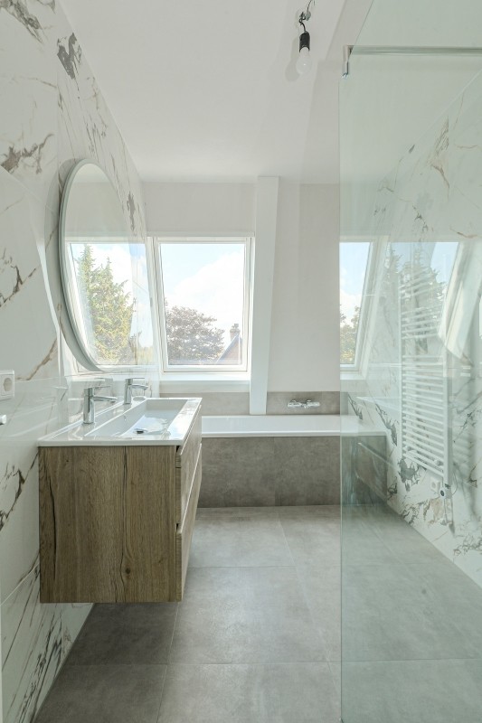 De moderne badkamer is geheel nieuw geplaatst en beschikt over een inloopdouche, ligbad, dubbele wastafel, marmeren look wandafwerking, een Velux dakraam en een designradiator.