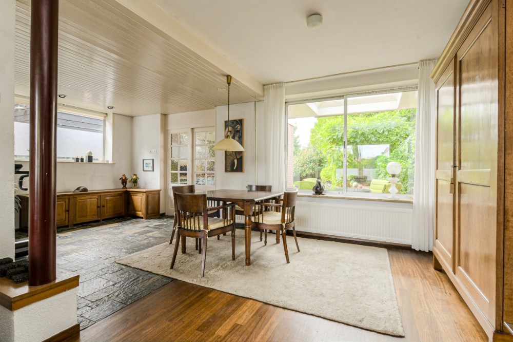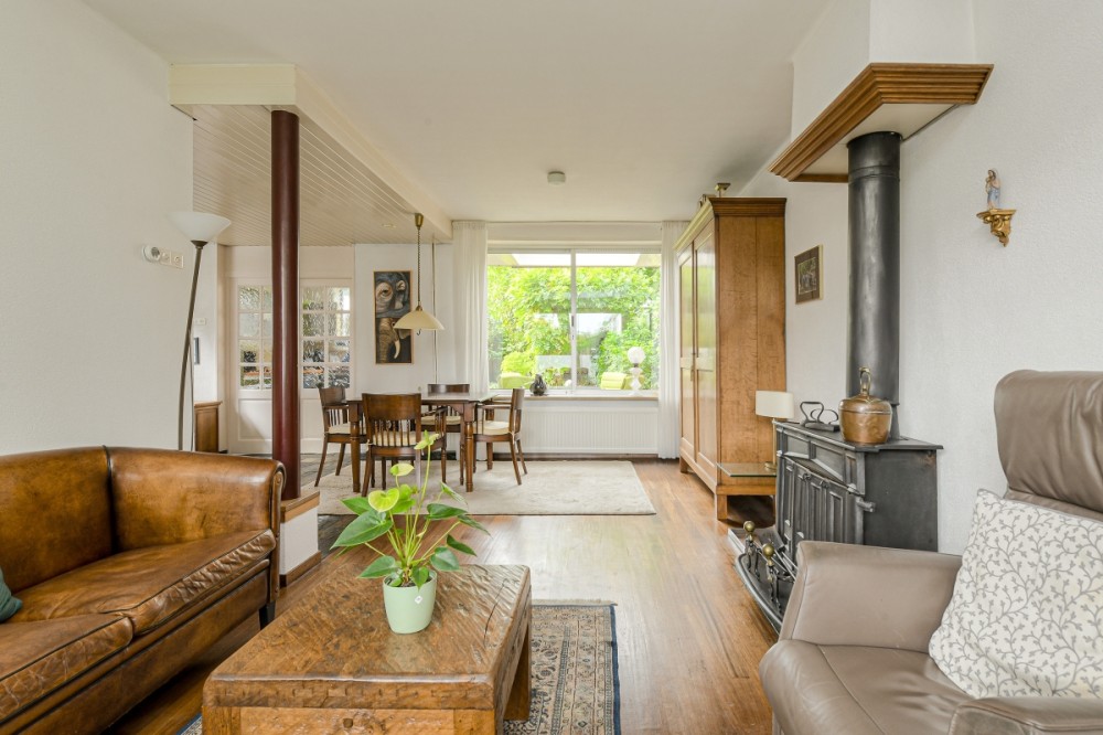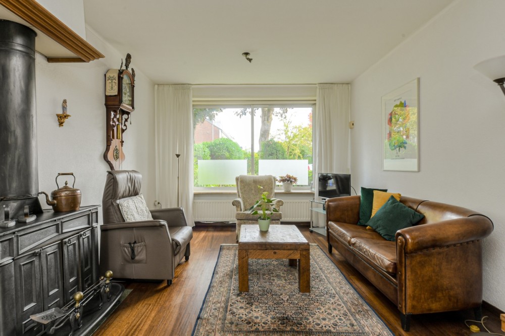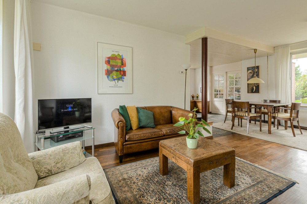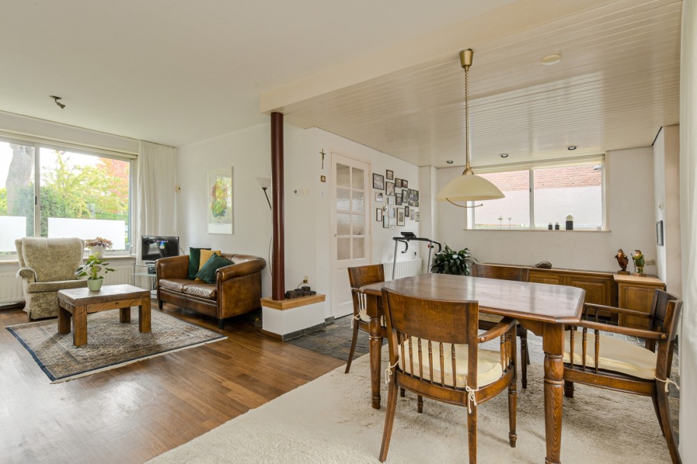 De riante woonkamer in L opstelling afm. ca. 6.63 x 3.58 m beschikt over zeer veel lichtinval door de grote raampartijen. De woonkamer is v.v. een parketvloer en openhaard.