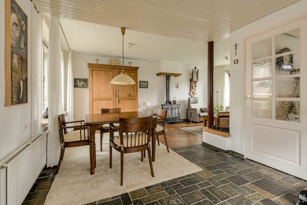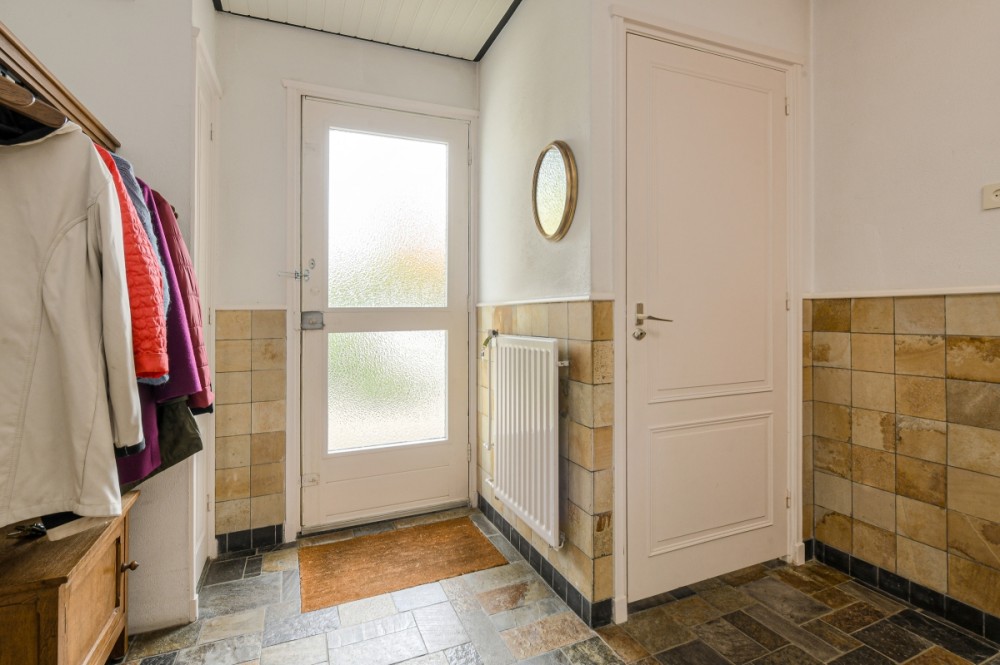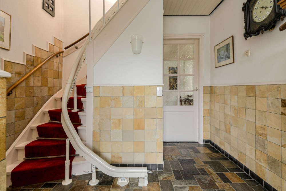 Entree / hal met garderobe, lambrisering, leistenenvloer, meterkast, toiletruimte v.v. fonteintje, trapopgang naar de eerste verdieping en toegang naar de woonkamer.
