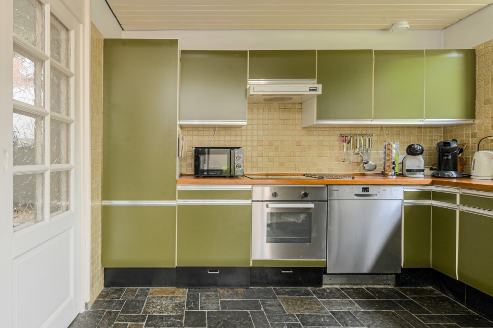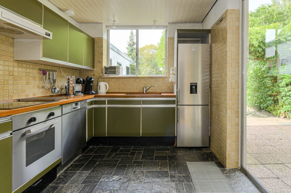 Aan de achterzijde, in de aanbouw georiënteerde keukenruimte welke beschikt over een nette keukeninrichting, in L- vorm met houten werkblad en diverse inbouwapparatuur, te weten: koelkast, diepvries, oven, 4 pits keramische kookplaat, afzuigkap en spoelbak. De woonkamer en de keuken worden gescheiden door een schuifdeur. De keuken beschikt over voldoende kastruimte en vanuit de keuken is de achtertuin te bereiken.