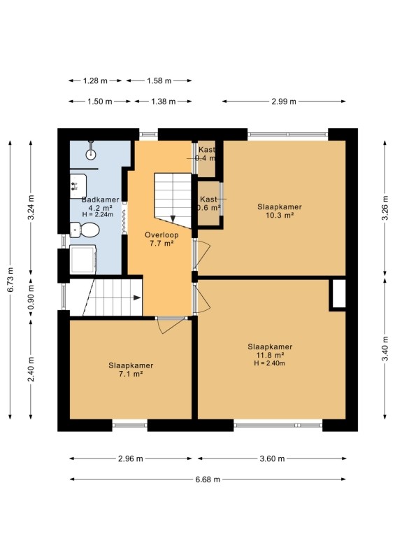 Slaapkamer 2, eveneens aan de voorzijde van de woning, heeft een afmeting van ca. 2.40 x 2.96m.