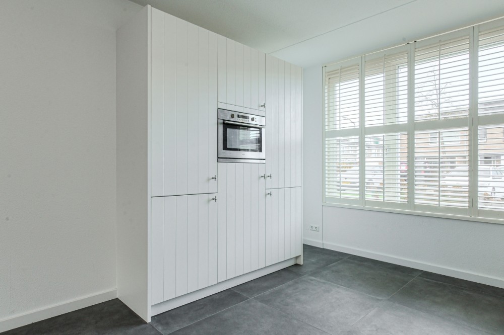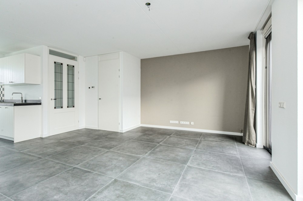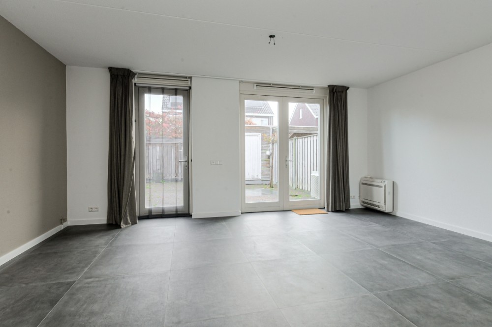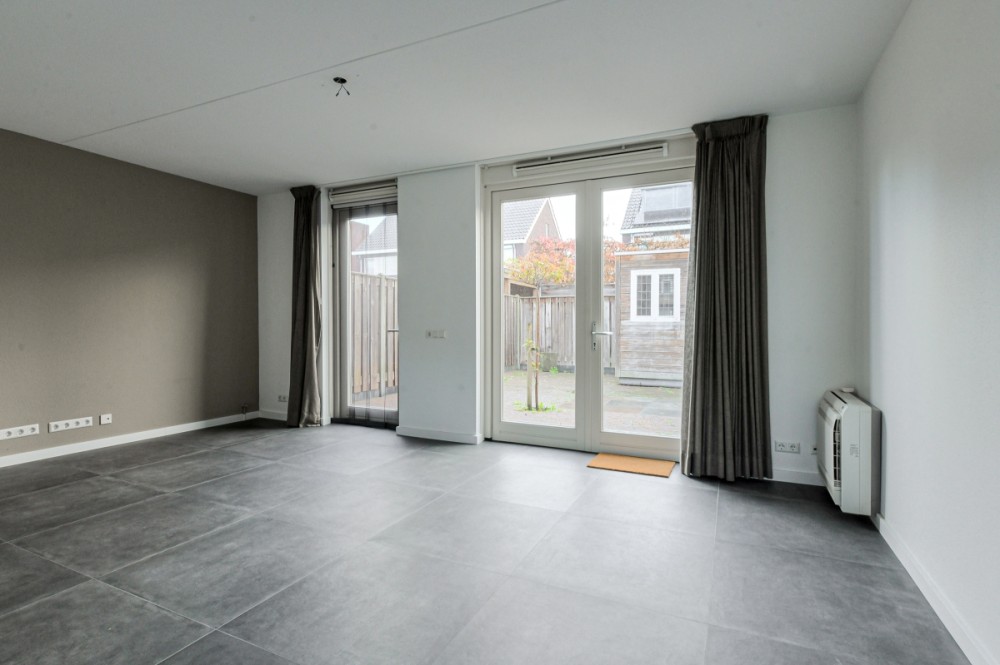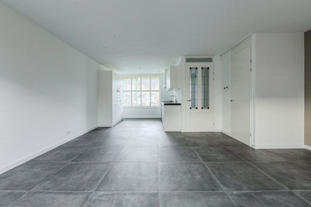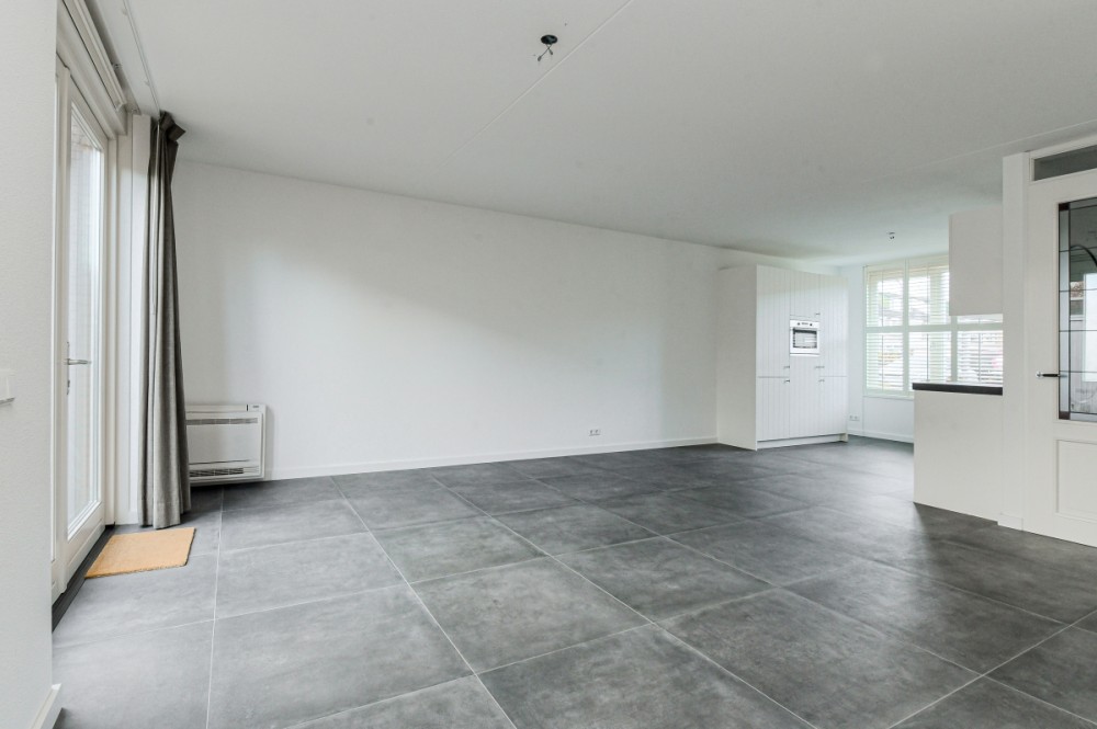 De tuin georiënteerde woonkamer met keramiek vloertegel en vloerverwarming (totaal ca. 40 m² inclusief open keuken) is voorzien van airco, vaste (trap)kast en openslaande deuren naar de achtertuin.