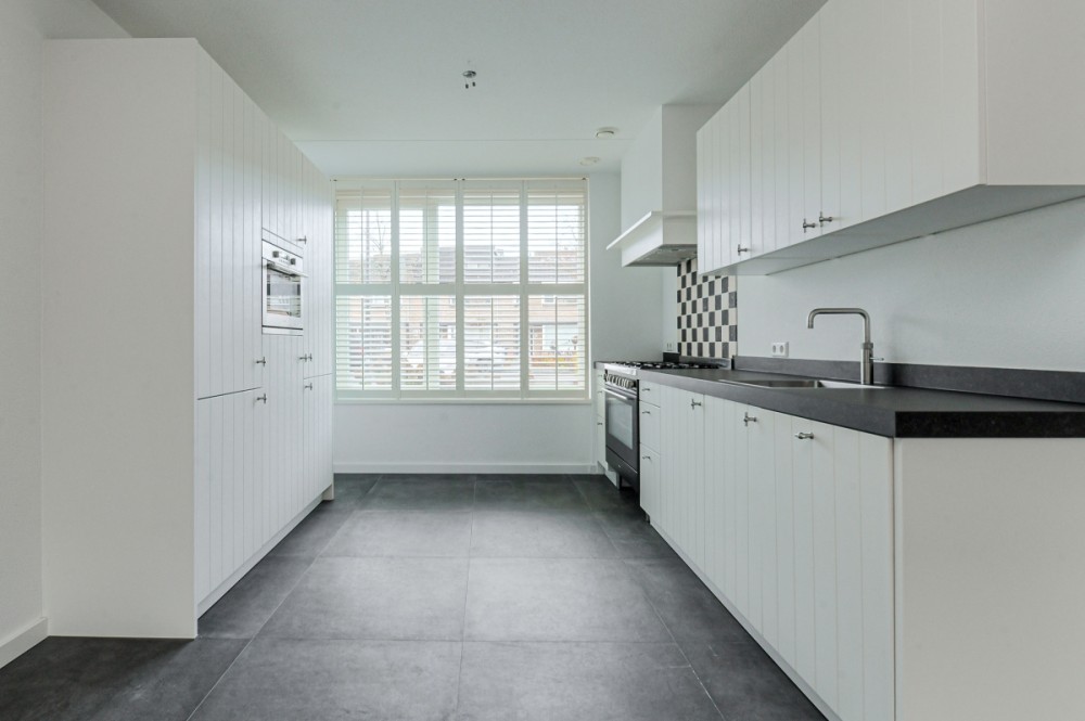 Aan de voorzijde gelegen open keuken welke is uitgerust met een keukenblok bestaande uit twee elementen met keramisch werkblad en welke is voorzien van diverse inbouwapparatuur te weten; 6 pits gaskookplaat, RVS-afzuigkap, Quooker, combi oven/ magnetron, koel/ vrieskast, vaatwasser en veel kastruimte.