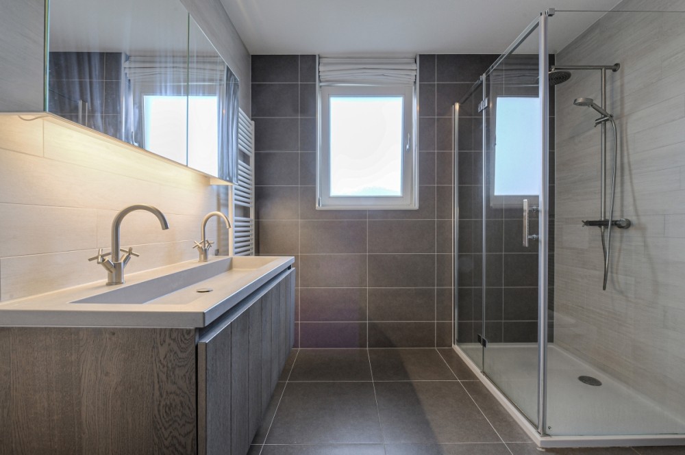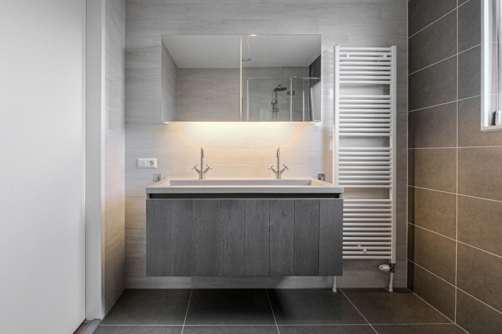 Luxe geheel betegelde badkamer met (regen) inloopdouche, twee persoonswastafel met meubel, tweede hangcloset en design radiator.