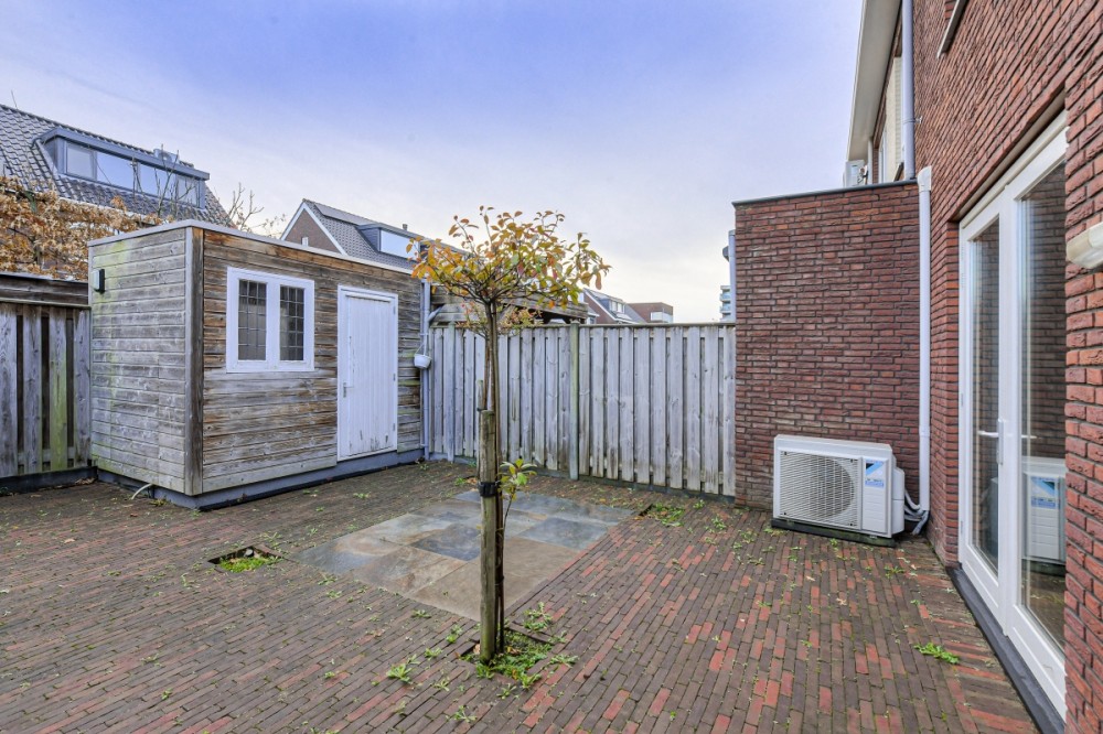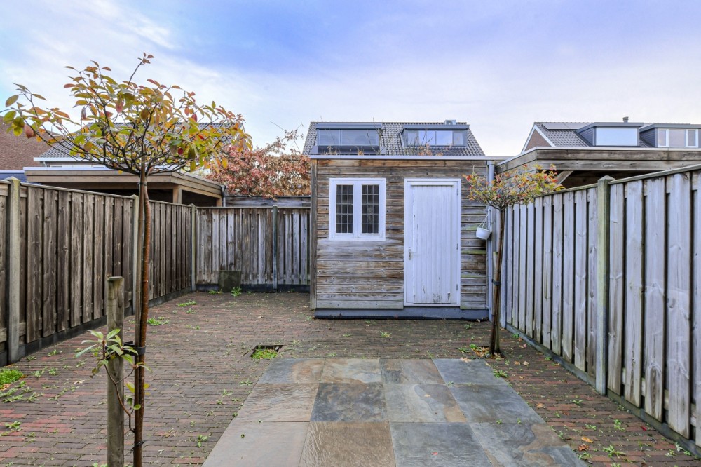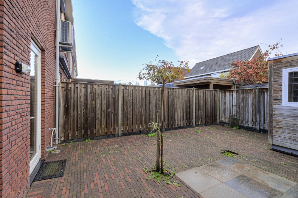 De op het oosten gelegen achtertuin met diverse borders met beplanting is voorzien van een gebakken stenenterras en een ruime berging met elektra en loopdeur naar de afgesloten brandgang.