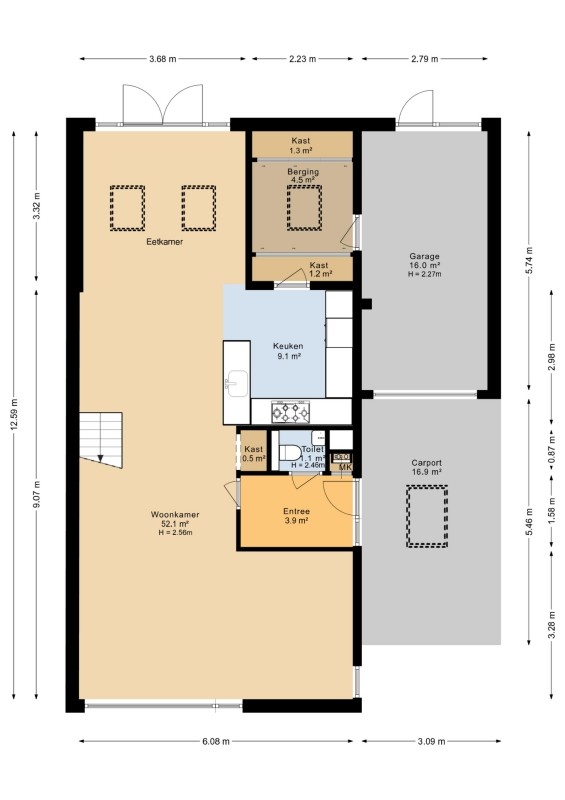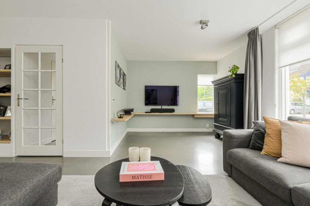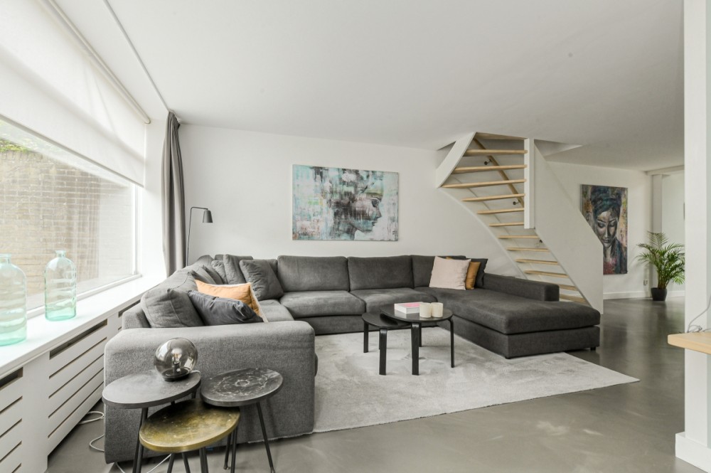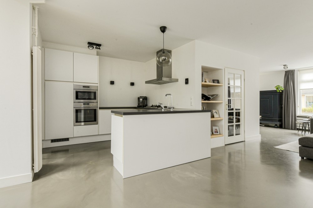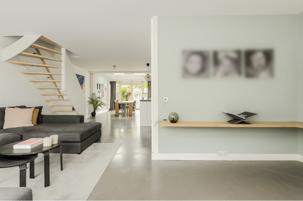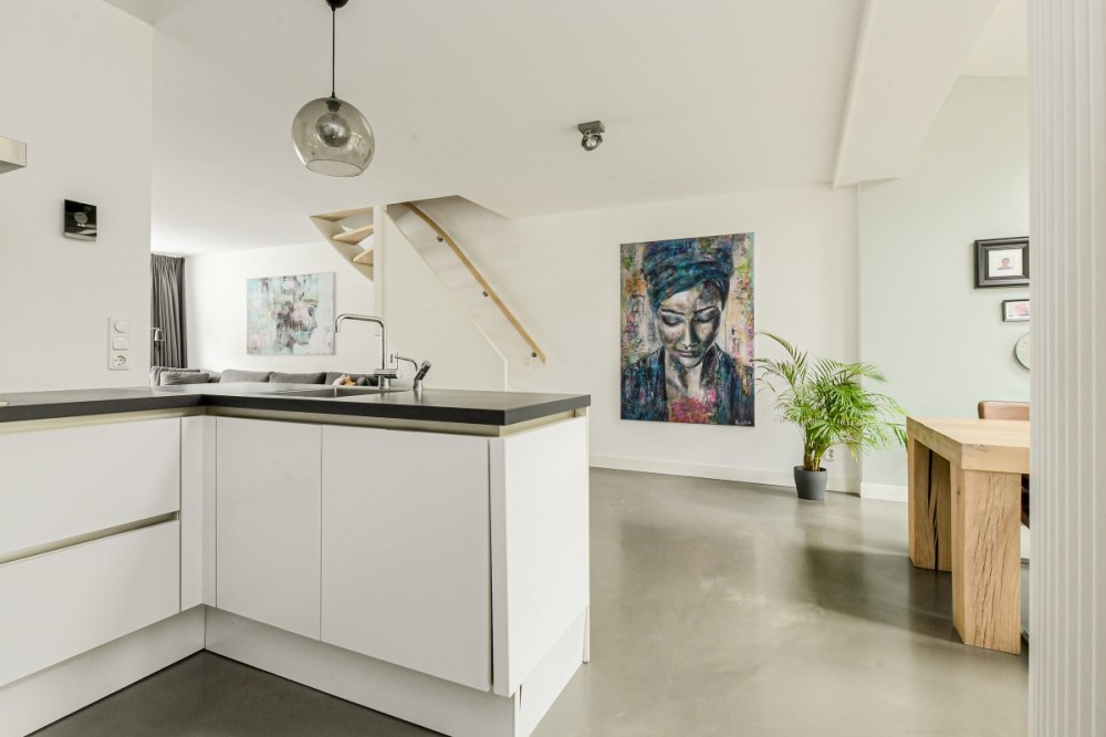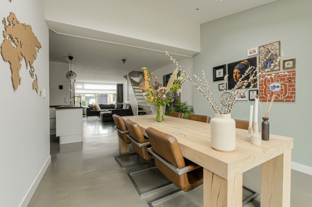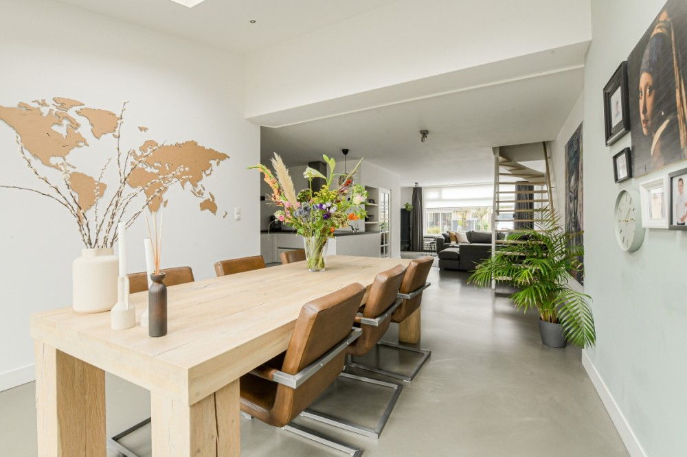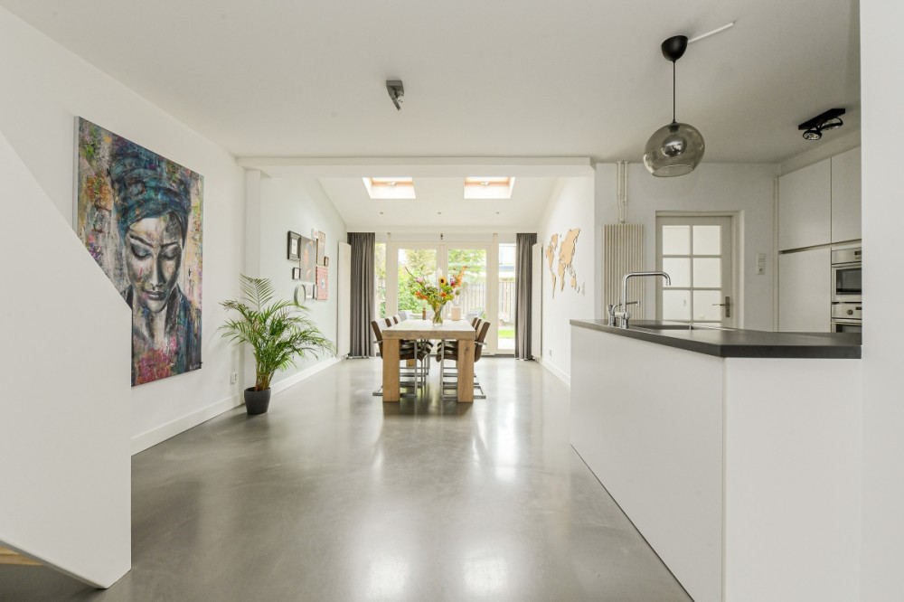 De ruime doorzon woonkamer, afmeting ca. 12.60 x 6.08/3.68m, met gietvloer is opgedeeld in een ruim zitgedeelte aan de voorzijde en een in de uitbouw gelegen eetkamer welke is voorzien van openslaande tuindeuren en 2 Velux ramen. Vanuit de woonkamer heeft u toegang middels de vernieuwde trap tot de eerste verdieping.