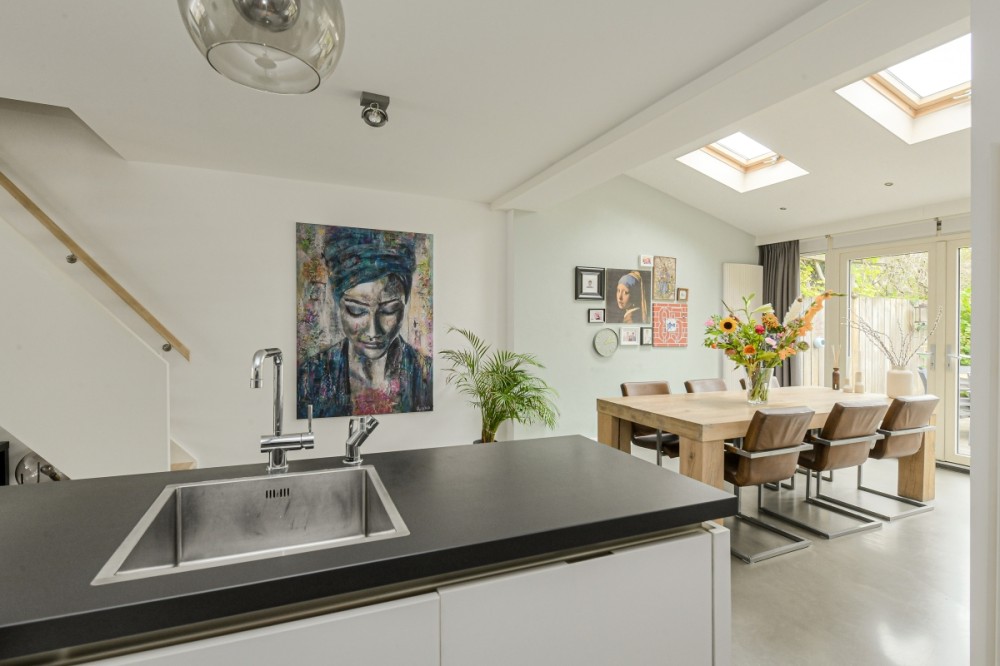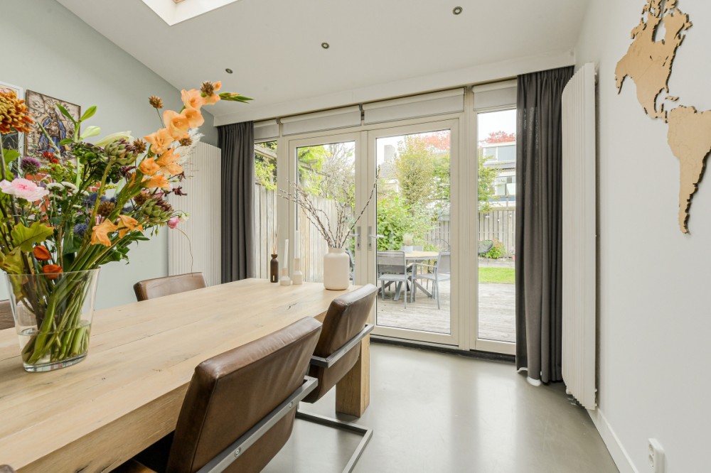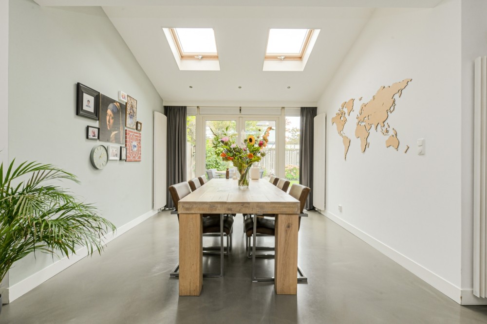 -Aan de achterzijde uitgebouwde eetkamer met openslaande tuindeuren en twee grote Velux ramen.