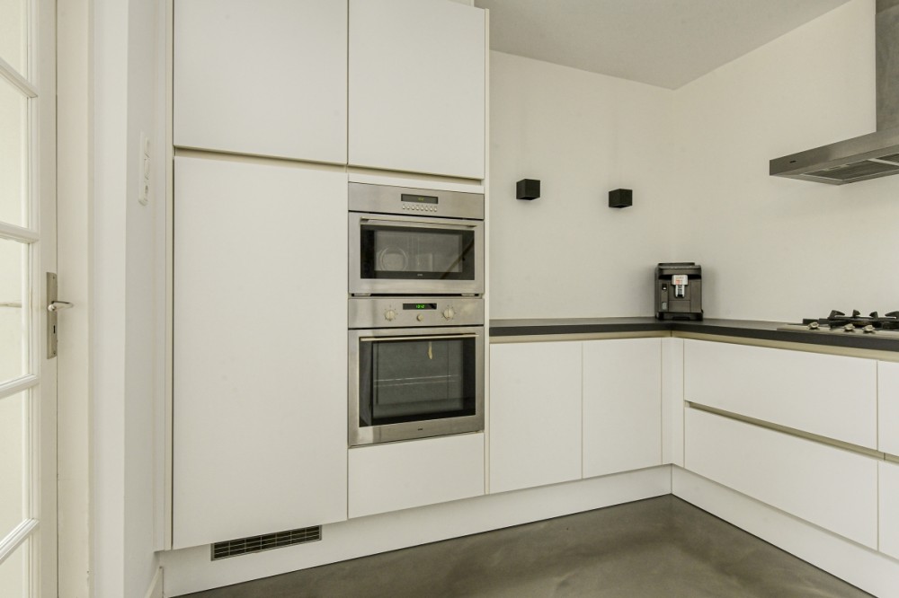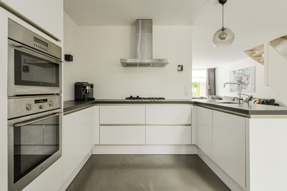 De openkeuken is gelegen aan de achterzijde van de woning en is voorzien van een U-vormig keukenblok uitgerust met een 5 pits gaskookplaat, RVS afzuigkap, elektrische oven, combi oven/ magnetron, koelkast en vaatwasser en ruim voldoende boven en onder kastruimte.