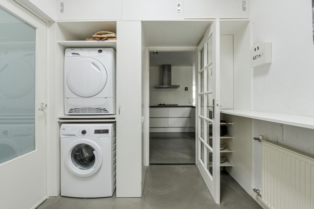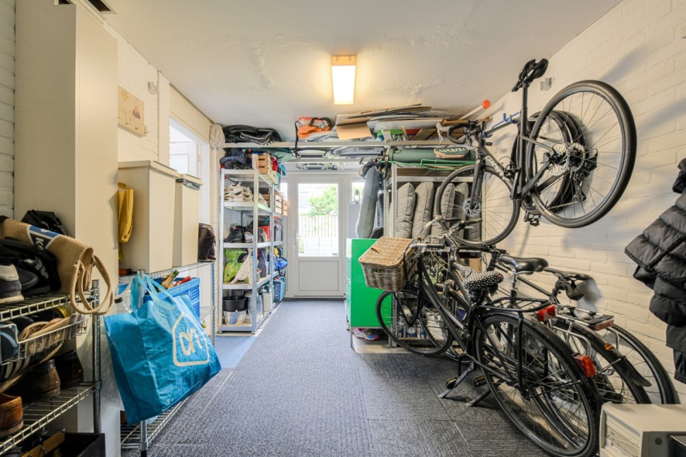Vanuit de keuken is de bijkeuken bereikbaar welke is voorzien van een vaste kast en opstelplaats wasmachine/ droger. De bijkeuken geeft middels de loopdeur toegang tot de garage.De garage is toegankelijk vanuit de bijkeuken als vanuit de tuin en beschikt over elektra en openslaande deuren/ loopdeur. De garage geeft toegang tot de carport en de oprit welke geschikt is voor meerdere auto’s.