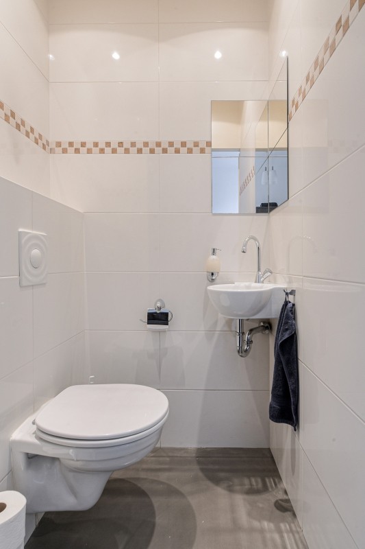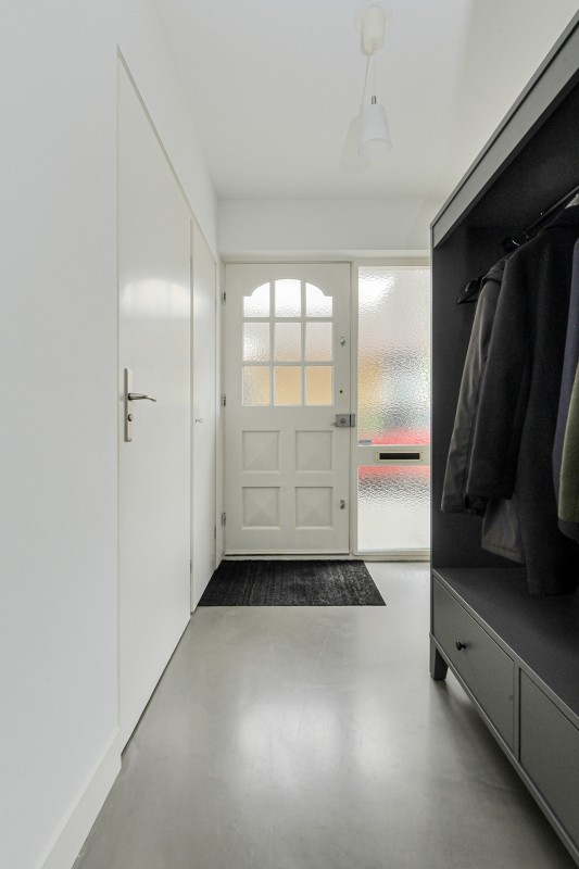 Via de overdekte entree betreedt u deze woning. In de hal bevinden zich de meterkast en de geheel betegelde toiletruimte v.v. hangend toilet met fonteintje. Vanuit de entree heeft u toegang tot de woonkamer.