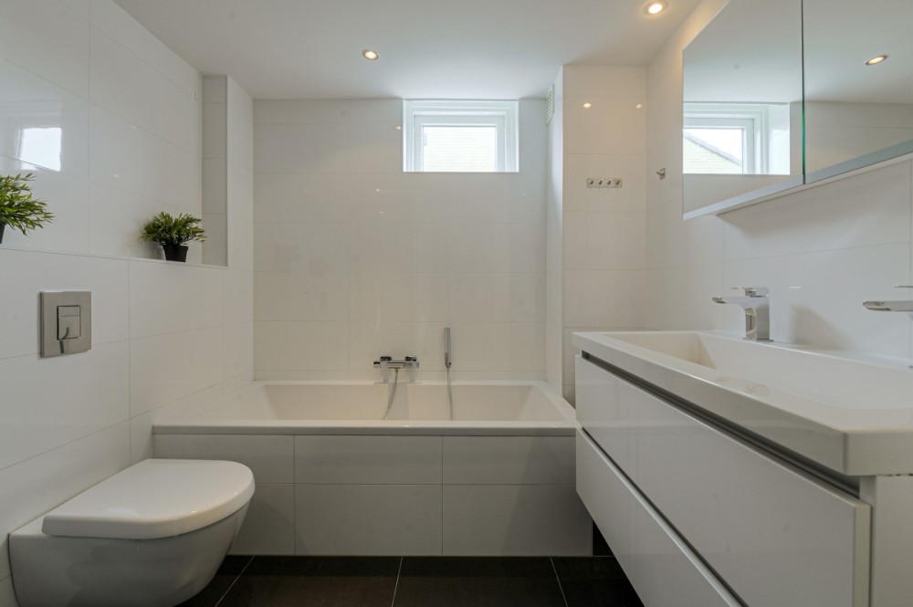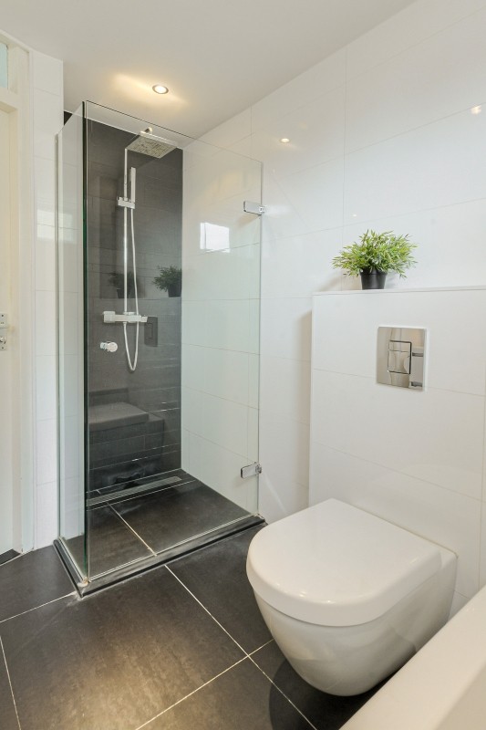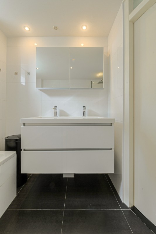 Tot het plafond betegelde, gemoderniseerde badkamer met wandcloset, inloopdouche met regendouche en twee persoons wastafelmeubel.