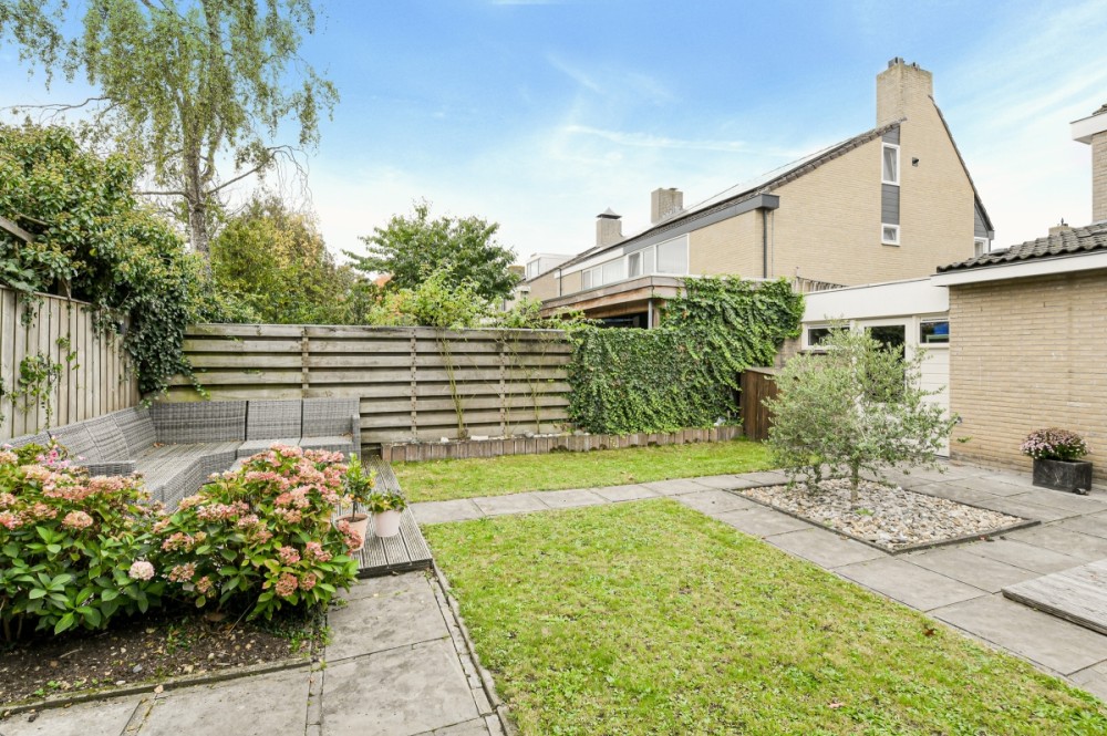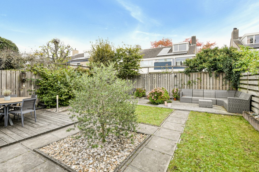 De achtertuin is op het oosten gesitueerd en is voorzien van een terras, sierbestrating, gazon en diverse plantenborders met volwassen beplanting.