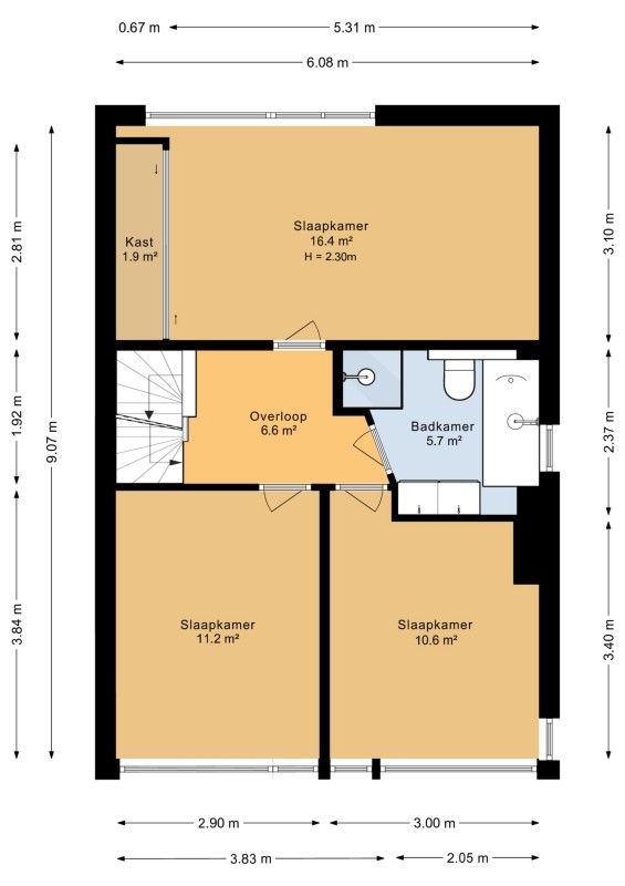 De overloop geeft toegang tot de badkamer, drie slaapkamers en vaste trapopgang naar de tweede verdieping.
