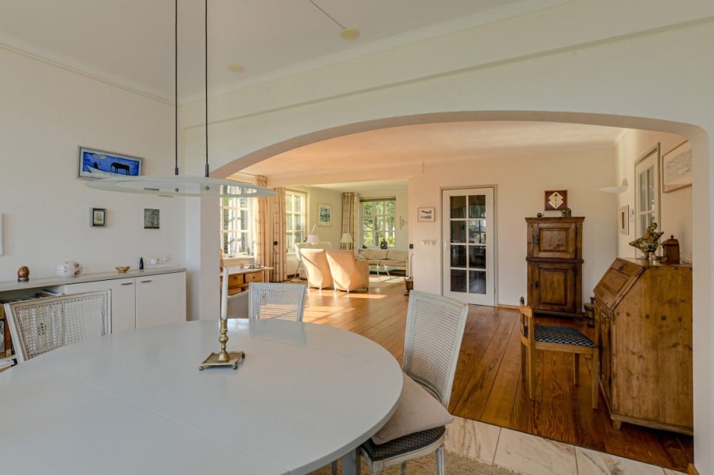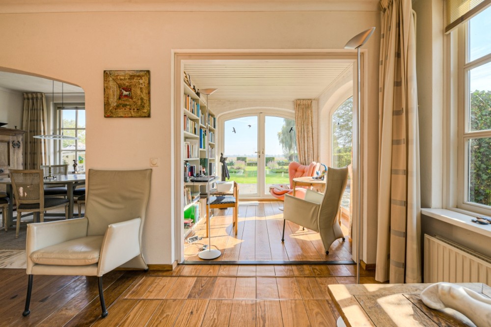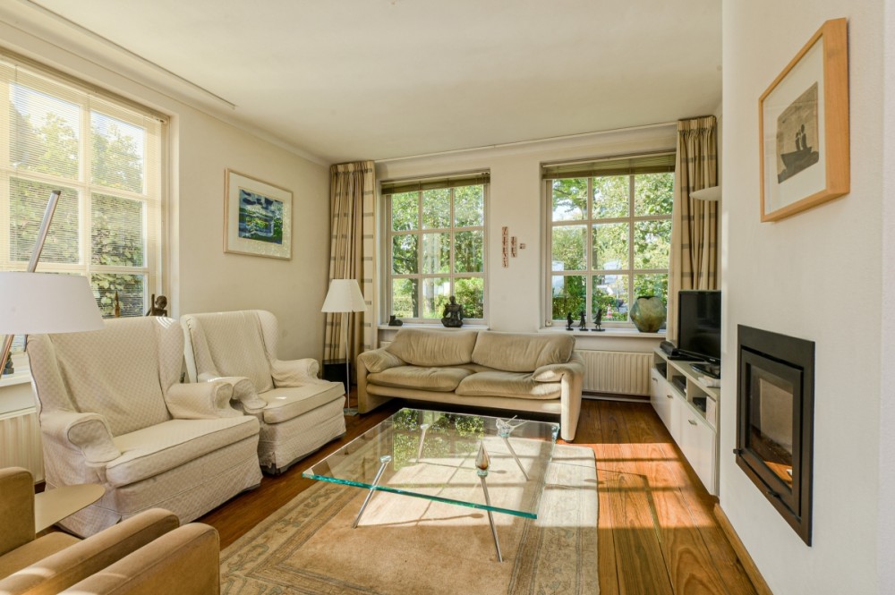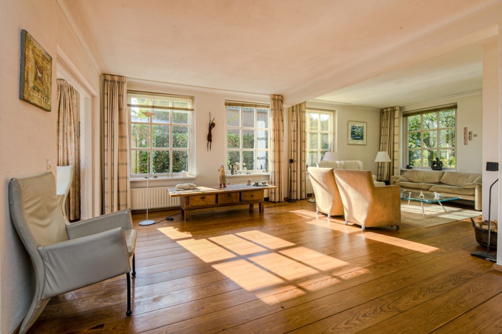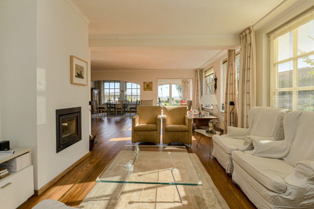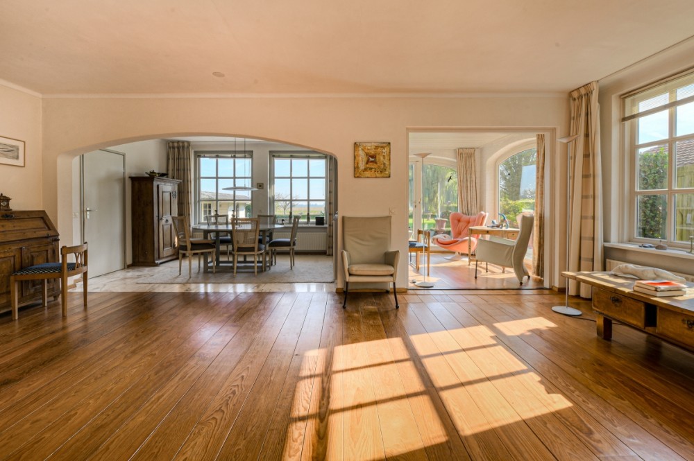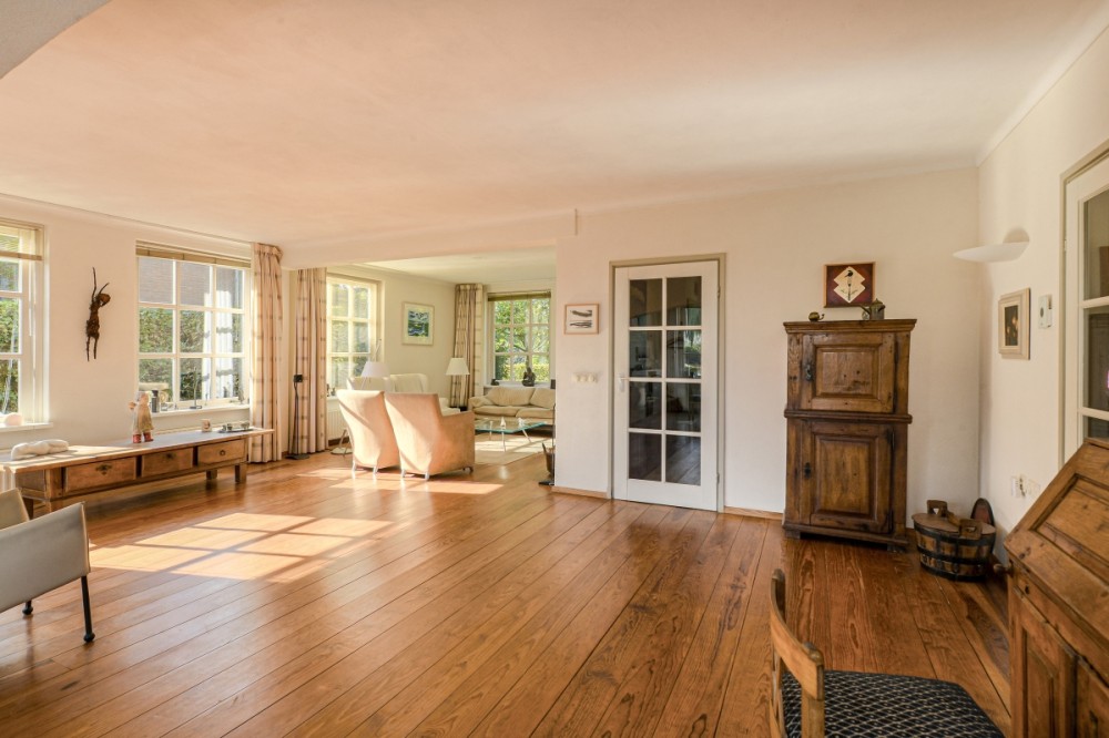 De ruime living is voorzien van een warme houten vloer en onderverdeeld in een sfeervol zitgedeelte met schouw en open haard. Grote ramen met roedeverdeling zorgen voor een prachtige lichtinval en een fraai uitzicht.