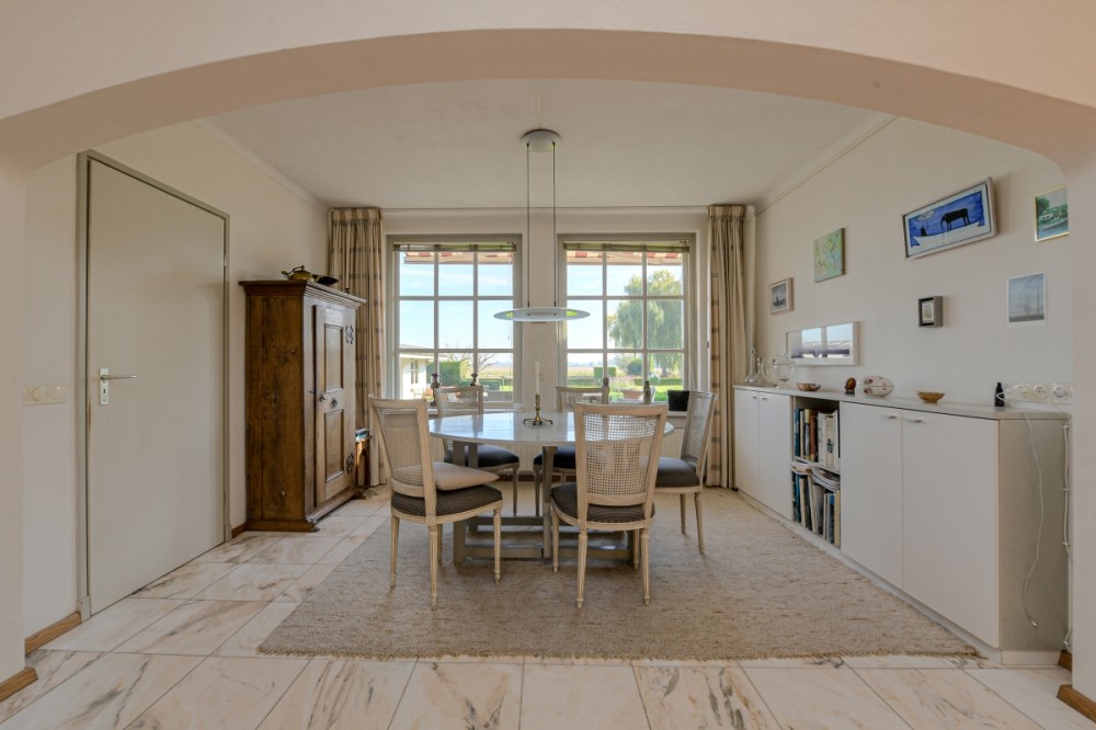 De eetkamer met travertin vloer kijkt uit op de tuin en geeft toegang tot de keuken.