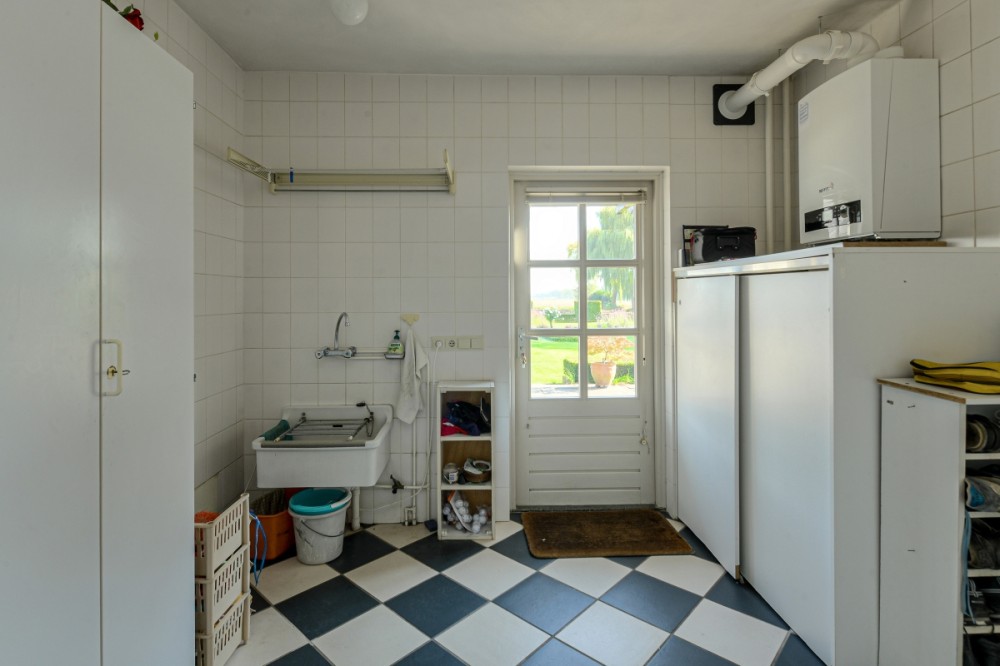 Ruime betegelde bijkeuken voorzien van een uitstortgootsteen, de opstelplaats voor de cv-unit, praktische kastruimte en directe toegang tot de tuin.