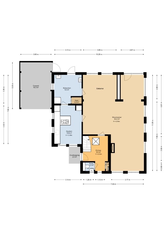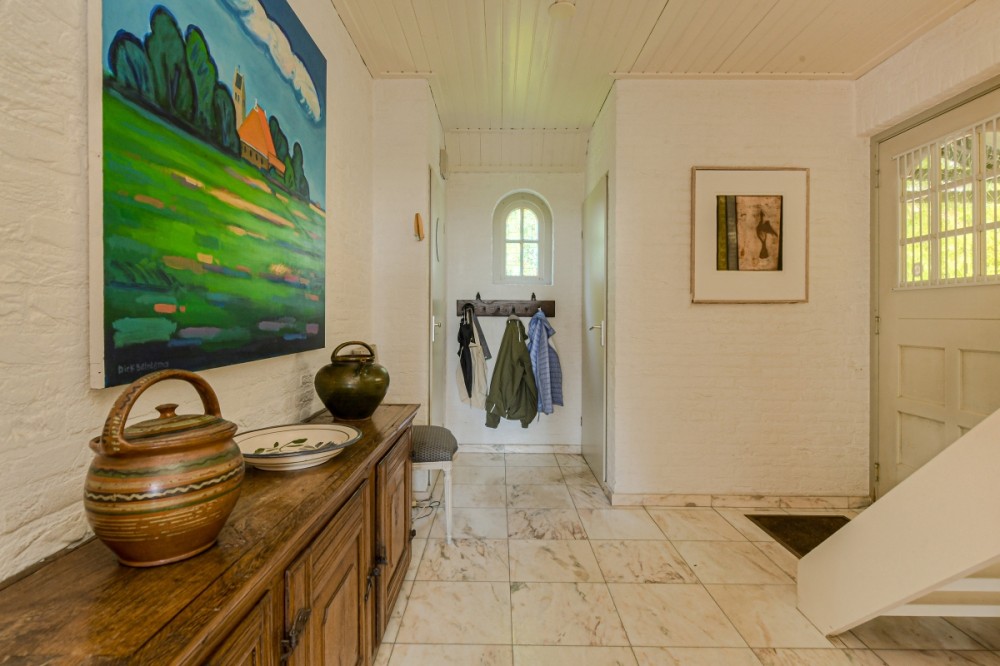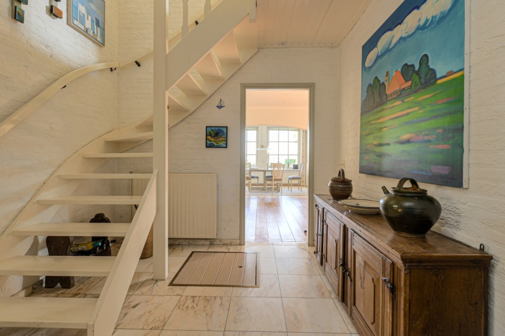 De woning heeft een royale entree met een travertin vloer. In de hal bevinden zich het toilet, de meterkast, de trap naar de 1e verdieping en een luik naar de (wijn)kelder.