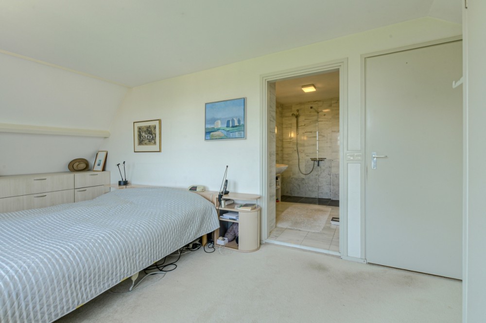 De ruime ouderslaapkamer, afmeting ca. 14,8m², met 2 vaste kasten is voorzien van een eigen badkamer uitgerust met een inloopdouche en dubbele wastafel, wat zorgt voor extra comfort en privacy.