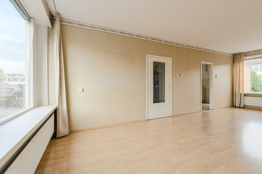 Woon-/eetkamer afmeting circa 7.82 x 3.68 m, type doorzon met nette laminaat vloerafwerking en grote raampartijen aan de voor- en achterzijde.